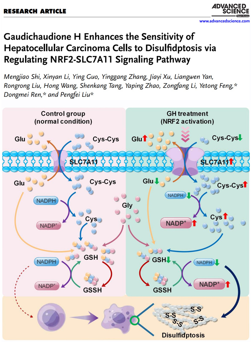 近日,课题组在国际权威杂志《Advanced Science》(IF=14.3,中科院1区Top期刊)上以封面文章形式发表了一项题为“Gaudichaudione H Enhances the Sensitivity of Hepatocellular Carcinoma Cells to Disulfidptosis via Regulating NRF2-SLC7A11 Signaling Pathway”的重要研究成果。该研究揭示了从传统中药单花山竹子中提取的活性成分Gaudichaudione H(GH)在调控肝癌细胞双硫死亡(disulfidptosis)方面的潜力,为耐药性肝癌的治疗提供了新思路。