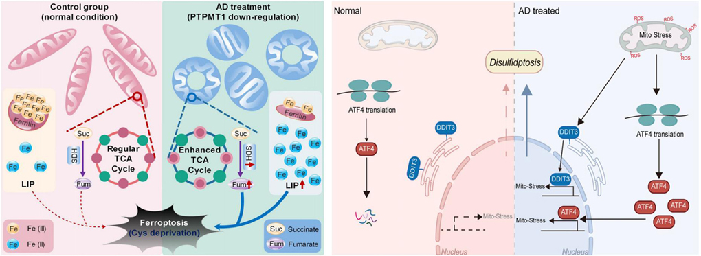 铁死亡(Ferroptosis)是一种2012年发现的铁依赖性调节性细胞死亡形式,由脂质过氧化驱动,核心特征包括谷胱甘肽(GSH)耗竭、谷胱甘肽过氧化物酶4(GPX4)失活及活性氧(ROS)累积。而双硫死亡(Disulfidptosis)是2023年新发现的死亡类型,由葡萄糖饥饿引发SLC7A11高表达细胞内的二硫化物应激导致。其特征是肌动蛋白骨架蛋白异常二硫键交联,引发细胞骨架结构异常,独立于铁死亡、凋亡等已知途径。在本项研究工作中,团队发现线粒体内膜磷酸酶PTPMT1是调控肝癌细胞铁死亡的关键开关,利用CRISPR/Cas9基因编辑技术,研究者构建了PTPMT1基因敲除模型,发现AD通过抑制PTPMT1活性诱导三价铁向二价铁转化,显著提升胞内游离铁池水平,并引发导线粒体结构异常(肿胀/环状线粒体形成),同时通过增强琥珀酸向延胡索酸的代谢流,重塑三羧酸循环,进而提升肝癌细胞对半胱氨酸缺乏介导铁死亡的敏感性;另一方面,AD在影响线粒体结构和代谢的同时,可有效促进线粒体应激并激活未折叠蛋白反应,通过ATF4-DDIT3信号轴促进二硫键形成,导致细胞骨架蛋白的不可逆交联,增强了细胞对葡萄糖缺乏介导双硫死亡的敏感性,而AD在上述调节过程中,对PTPMT1具有非依赖性。由此提示:AD在调控肝癌细胞铁死亡和双硫死亡的过程中,核心信号机制具有显著的差异性(图1)。