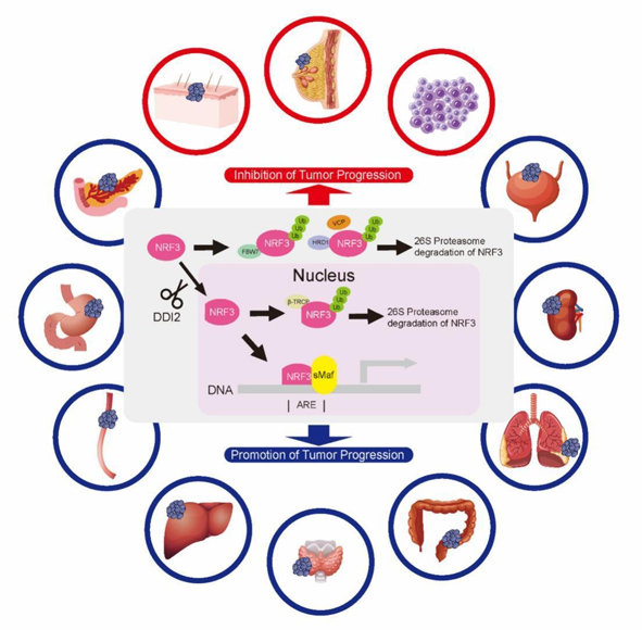 近日,团队在应邀在生物物理学领域JCR Q1区期刊《Biochimica et Biophysica Acta (BBA)-Molecular Basis of Disease》(影响因子4.2)发表题为“The CNC-family transcription factor NRF3: A crucial therapeutic target for cancer treatment”的综述论文,系统总结了转录因子NRF3(NFE2L3)在肿瘤发生发展中的双重调控作用及其临床转化价值,为开发新型靶向抗癌策略提供了重要理论依据。