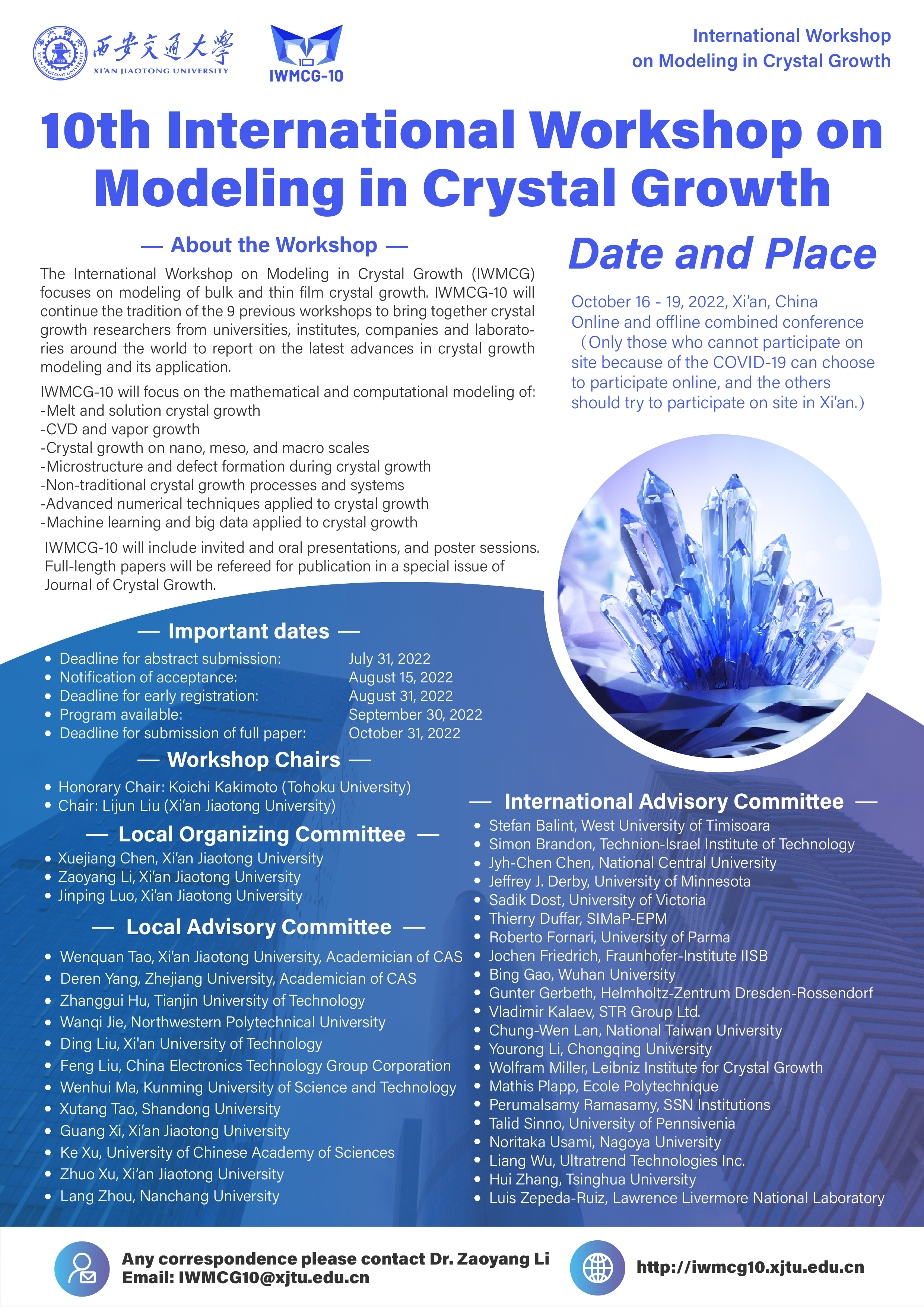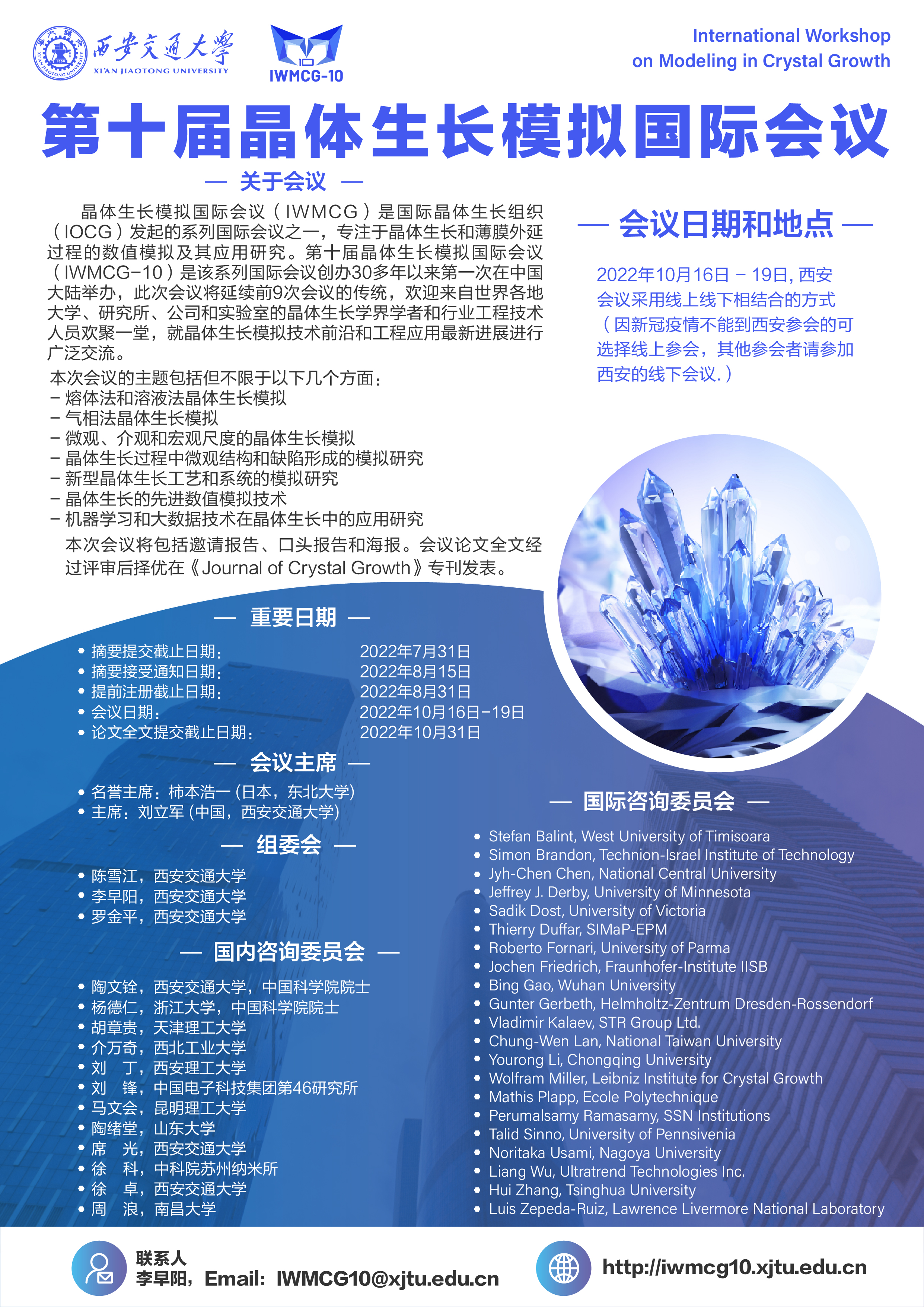 由世界晶体生长协会(International Organization for Crystal Growth, IOCG)发起、中国晶体生长学会协办(Chinese Association for Crystal Growth, CACG)、中国西安交通大学承办的第十届晶体生长模拟国际会议(The 10th International Workshop on Modeling in Crystal Growth, IWMCG-10)将于2022年10月16日-19日在西安召开。