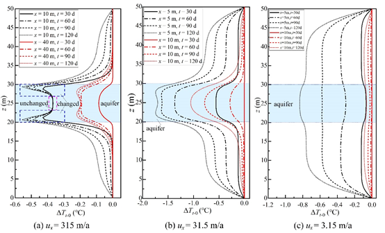 本研究为了探究地下含水层对地埋换热器周围地温场的影响,建立了由同心地埋换热器以及含水层和隔水层组成的模型,并进行了数值求解。结果揭示了含水层内地下水渗流速度的变化将会对地埋换热器周围温度场的波动产生明显的影响,温度场最大的温度波动取决于地下水渗流速度及运行时间。在地埋换热器取热过程中,含水层内的初始地温与瞬时地温之间的温差,以及此温差达到稳定的时间是与地下水渗流速度成反比的。当地下水渗流的速度从3.15 m/a 变化到315 m/a时,地埋换热器的热作用半径从7.4 m增加到了143.0 m。由于含水层与隔水层的热扩散系数的不同,以及地下水渗流速度的应用,含水层与隔水层的热作用半径会有所不同。会存在一个临界的地下水渗流速度,使得含水层和隔水层热作用半径相同,这个临界值可以作为是否考虑含水层影响的依据。除此之外,当地下水渗流速度大于临界速度时,含水层厚度增加会使含水层热作用半径增加,而当地下水渗流速度小于临界流速是,含水层厚度的增加则会使热作用半径减少。对热作用半径的变化规律的探究将为工程中井间距的设计提供重要指导。
