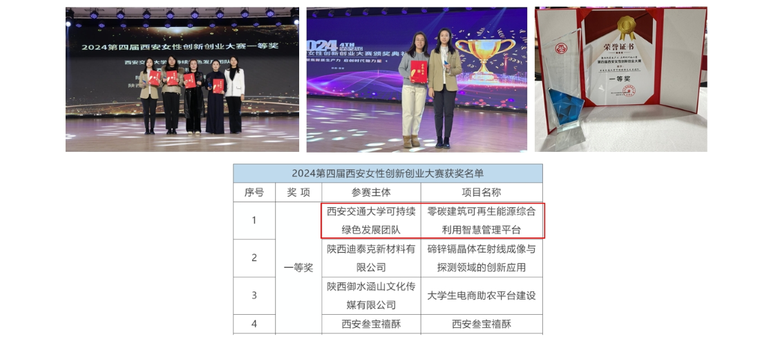 A team led by young teachers Qin Siyu, Liu Yilin, Jia guosheng, along with doctoral and master's students Ma Zhendi, Li Yingyue, Zou Yanhui, Liu Yijia, Li Jiayao, Zhang Meng, and Wu Ruiting, participated in the competition and won First Prize in the 2024 Fourth Xi’an Women’s Innovation and Entrepreneurship Competition. The team focused on the utilization and development of renewable and clean energy, building an innovative platform titled the “Zero-Carbon Building Renewable Energy Integrated Smart Management Platform.” The platform incorporates advanced assessment techniques based on multi-energy complementary mechanisms of geothermal and solar energy, along with multi-objective optimization technology and software for energy, cost-efficiency, and carbon emissions. It enables real-time monitoring and analysis of building energy consumption, provides AI-driven optimization of energy-saving strategies, and facilitates the integration and collaboration of various devices. This innovative platform stands out for its intelligent, customizable, and secure encryption features, making it a cutting-edge solution in the field.