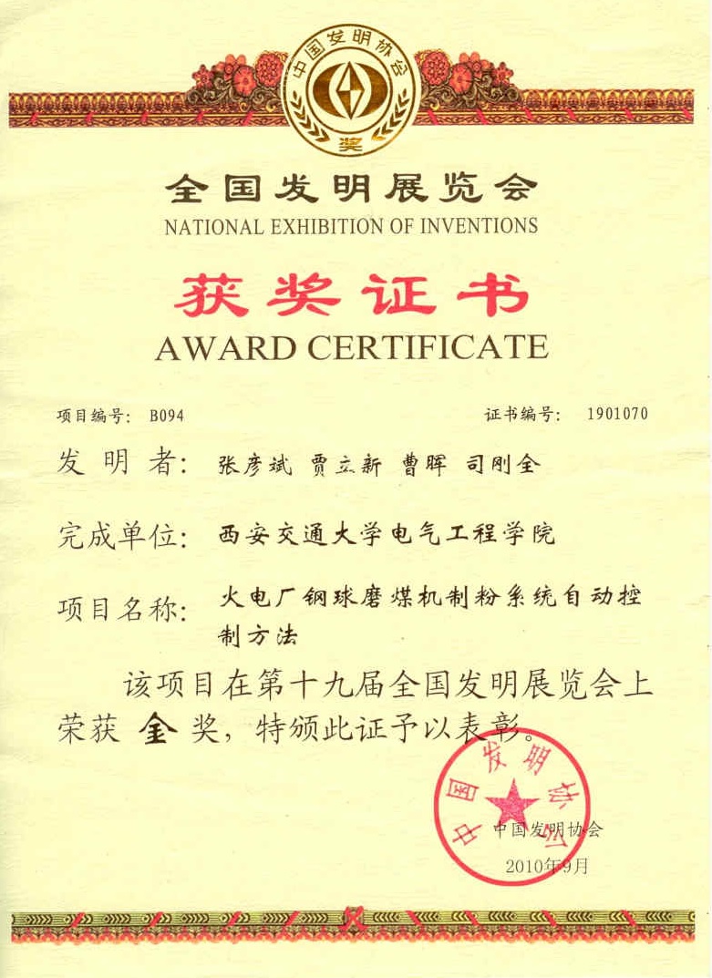 2002年 西安交通大学科技进步一等奖(第2完成人)