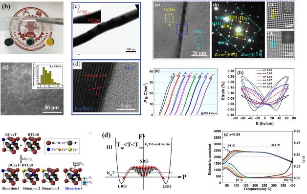 2021 1) Z. P. Wang, R. R. Kang, L. X. Zhang*, P. Mao, Q. Z. Sun, F. Kang, and J. P. Wang. Remarkably enhanced energy-storage density and excellent thermal stability under low electric fields of (Na0.5Bi0.5)TiO3-based ceramics via composition optimization strategy. Journal of the European Ceramic Society, 41: 1917-1924 (2021) 2) P. Mao, J. P. Wang, P Xiao, L. X. Zhang*, F. Kang, and H. Gong. Colossal dielectric response and relaxation behavior in novel system of Zr4+ and Nb5+ co-substituted CaCu3Ti4O12 ceramics. Ceramics International, 47: 111-120 (2021). 2020 3) Z. P. Wang, L. X. Zhang*, R. R. Kang, P. Mao, F. Kang, Q. Z. Sun, and J. P. Wang. High temperature dielectric stable (1-x)[(Na0.5Bi0.5)0.92Ba0.08]0.955La0.03TiO3-xNaNbO3 system with ultra-low dielectric loss range through optimizing the defect chemistry. Journal of Alloys and Compounds, 846: 156308 (2020) 4) P. Mao, J. P. Wang, L. Q. He, L. X. Zhang*, A. Annadi, F. Kang, Q. Z. Sun, Z. P. Wang, and H. Gong, Excellent Capacitor-Varistor Properties in Lead-Free CaCu3Ti4O12-SrTiO3 System with a Wrinkle Structure via Interface Engineering. ACS Applied Materials & Interfaces, 12: 48781-48793 (2020) 5) W. J. Yang, K. B. Chu, L. X. Zhang, X. D. Ding, J. Sun, J. Z. Liu, J. L. Song, C. X. Zheng, and J. K. Deng, Lead-free molecular ferroelectric [N,N-dimethylimidazole](3)Bi2I9 with narrow bandgap. Materials and Design, 193: 108868 (2020) 6) P. Mao, J. P. Wang, L. X. Zhang*, Wang, Z. P. Wang, F Kang, S. J. Liu, D. B. K. Lim, X.Wang, and H. Gong. Significantly enhanced breakdown field with high grain boundary resistance and dielectric response in 0.1Na0.5Bi0.5TiO3-0.9BaTiO3 doped CaCu3Ti4O12 ceramics. Journal of the European Ceramic Society, 40: 3011-3018 (2020) 7) P. Mao, J. P. Wang, L. X. Zhang*, Q. Z. Sun, X. X. Liu, L. Q. He, S. J. Liu, S. W. Zhang, H.Gong, Tunable dielectric polarization and breakdown behavior for high energy storage capability in P(VDF-TrFE-CFE)/PVDF polymer blended composite films. Physical Chemistry Chemical Physics, 22: 13143-13153 (2020) 8) Q. Z. Sun, J. P. Wang, L. X. Zhang*, P. Mao, Liu, S. J. Liu, L. Q. He, F. Kang, and R. Xue. Achieving high energy density and discharge efficiency in multi-layered PVDF-PMMA nanocomposites composed of 0D BaTiO3 and 1D NaNbO3@SiO2. Journal of Materials Chemistry C, 8: 7211-7220 (2020) 9) Q. Z. Sun, P. Mao, L. X. Zhang*, J. P. Wang, Y. Y. Zhao, and F. Kang. Significantly enhanced dielectric and energy storage performance of AlN/KNbO3/PVDF sandwich-structured composites via introducing the AlN/PVDF insulating layers. Ceramics International, 46: 9990-9996 (2020) 10) F. Kang, Zhang, L. X. Zhang*, B. Huang, P. Mao, Z. P. Wang, Q. Z. Sun, J. P. Wang, and D. W. Hu. Enhanced electromechanical properties of SrTiO3-BiFeO3-BaTiO3 ceramics via relaxor behavior and phase boundary design. Journal of the European Ceramic Society, 40: 1198-1204 (2020) 11) L. Q. He, Y. C. Ji, S. Ren, L. Zhao, H. Y. Luo, C. Liu, Y. S. Hao, L. Zhang, L. X. Zhang*, and X. Ren. Large piezoelectric coefficient with enhanced thermal stability in Nb5+-doped Ba0.85Ca0.15Zr0.1Ti0.9O3 ceramics. Ceramics International, 46: 3236-3241 (2020) 2019 12) P. Mao, J. P. Wang, S. J. Liu, L. X. Zhang*, Y. Y. Zhao, K. N. Wu, Z. P. Wang, and J. Y. Li. Improved dielectric and nonlinear properties of CaCu3Ti4O12 ceramics with Cu-rich phase at grain boundary layers. Ceramics International, 45: 15082-15090 (2019) 13) P. Mao, J. P. Wang, Zhang, L. X. Zhang*, S. J. Liu, Y. Y. Zhao, Sun, and Q. Z. Sun. Rapid fabrication and improved electrical properties of CaCu3Ti4O12 ceramics by sol-gel and spark plasma sintering techniques. Journal of Materials Science-Materials in Electronics, 30: 13401-13411 (2019) 14) L. Zhao, X. Q. Ke, W. C. Wang, M. X. Fang, A. D. Xiao, L. Q. He, L. X. Zhang, J. H. Gao, Y. Z. Wang, and X. B Ren. Mechanism of electrostrain enhancement in the single rhombohedral phase region of Ba(Ti1-xZrx)O3 ceramics. Journal of Alloys and Compounds, 788: 748-755 (2019) 15) M. Y. Yin, C. Zhou, S. Ren, Y. S. Hao, M. X. Fang, W. J. Wang, J. H. Gao, T. Y. Ma, L. X. Zhang, S. Yanga, and X. B. Ren. Ceramics International, 45: 10304-10309 (2019) 16) P. Mao, J. P. Wang, S. J. Liu, L. X. Zhang*, Y. Y. Zhao, and L. Q. He. Grain size effect on the dielectric and non-ohmic properties of CaCu3Ti4O12 ceramics prepared by the sol-gel process. Journal of Alloys and Compounds, 778: 625-632 (2019) 17) Y. Yang, Z. J. Zhou, L. P. Xin, C. Zhou, L. X. Zhang, A. D. Xiao, and X. B. Ren, Large Electrostrain from the Ferroelectric Aging Effect around a Morphotropic Phase Boundary. Journal of Physical Chemistry C, 123: 3321-3325 (2019) 2018 18) M. X. Fang, Y. C. Ji, Z. Zhang, Y. D. Yang, C. Liu, D. Wang, L. X. Zhang, J. H. Gao, and X. B. Ren. Re-entrant relaxor-ferroelectric composite showing exceptional electromechanical properties. Npg Asia Materials, 10: 1029-1036 (2018) 19) X. Wang, S. J. Liu, L. X. Zhang*, J. P. Wang, and Y. Y. Zhao. Influence of sintering time and donor concentration on the PTCR effect of La-doped BaTiO3-Na0.5Bi0.5TiO3 ceramics. Ceramics International, 44: S216-S219 (2018) 20) S. J. Liu, Q. D. Xie, L. X. Zhang*, Y. Y. Zhao, X. Wang, P. Mao, J. P. Wang, and X. J. Lou. Tunable electrocaloric and energy storage behavior in the Ce, Mn hybrid doped BaTiO3 ceramics. Journal of the European Ceramic Society, 38: 4664-4669 (2018) 21) J. P. Wang, Zhao, Y. Y. Zhao, X. J. Shi, Zhang, L. X. Zhang*. Effect of Mn dopant on the grain size and electrical properties of (Ba, Sr)TiO3 ceramics. Journal of Materials Science-Materials in Electronics, 29: 11575-11580 (2018) 22) C. Zhou, X. Q. Ke, Y. G. Yao, S. Yang, Y. C. Ji, W. F. Liu, Y. D. Yang, L. X. Zhang, Y. S. Hao, S. Ren, L. Zhang, and X. B. Ren. Evolution from successive phase transitions to "morphotropic phase boundary" in BaTiO3-based ferroelectrics. Applied Physics Letters, 112: 182903 (2018) 2017 23) S. J. Liu, L. X. Zhang*, J. P. Wang, Y. Y. Zhao, and X. Wang. Abnormal Curie temperature behavior and