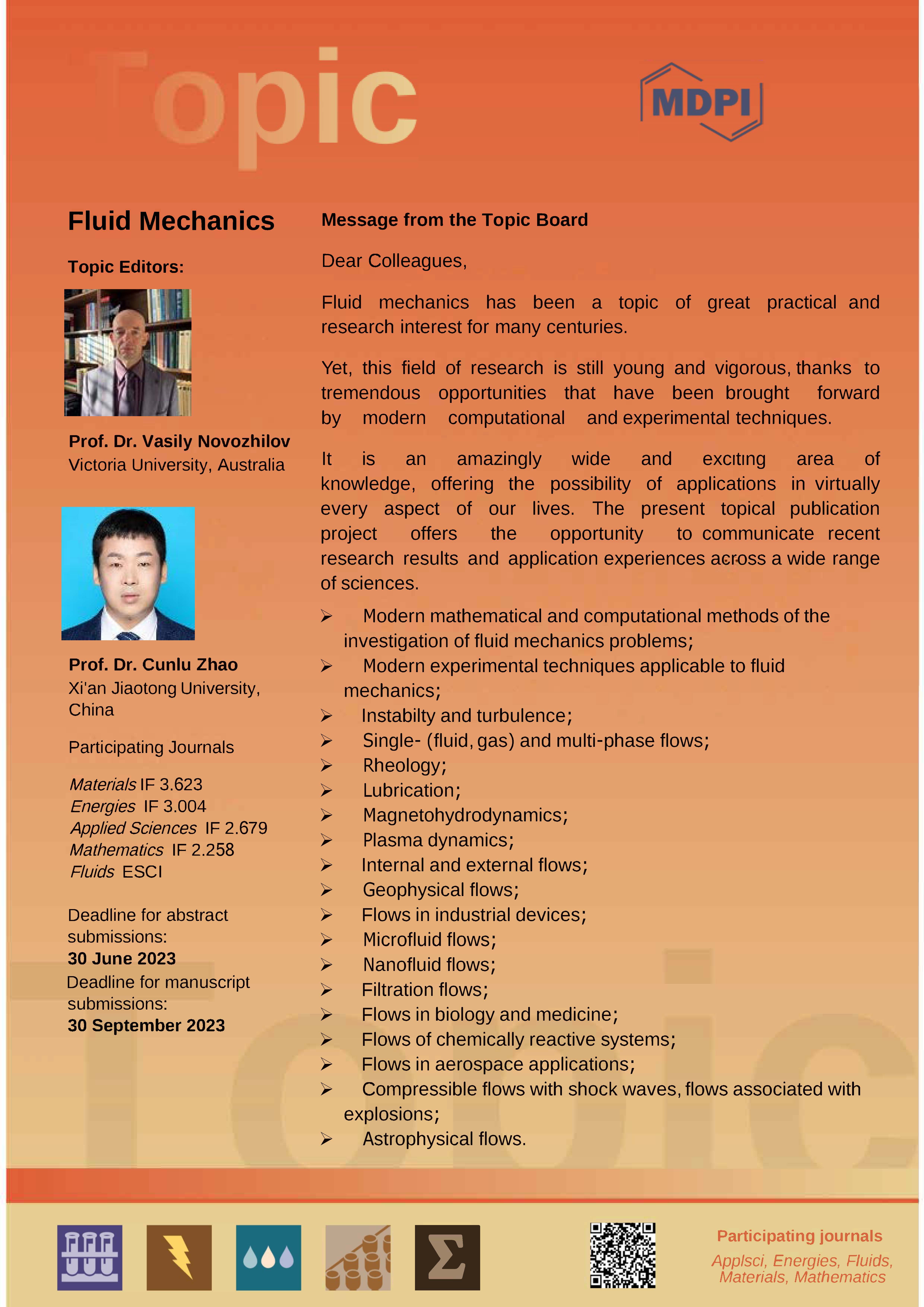 We are organizing a topic of "Fluid Mechanics" with MDPI journals to showcase the latest development in fluid mechanics. We welcome the submissions in various branches of fluid mechanics, and the details can be found in the attached flyer. Thank You!