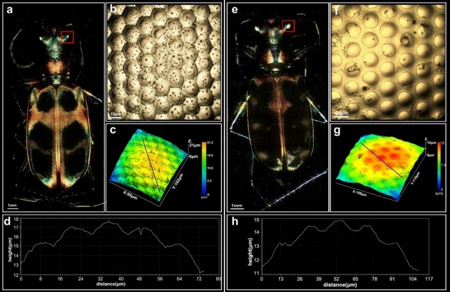 图2两种中华虎甲的三维成像结果。(a) 虎甲1的最大值投影图,其三维成像体积约为18.7 × 9.4 × 7.0 mm3。(b)图(a)中红色方框内区域进行成像的最大值投影结果。(c) 图(b)的三维形貌信息。(d) 图(c)中蓝色曲线所经过的复眼的三维轮廓曲线。(e) 虎甲2的最大值投影,其三维成像体积约为19.5 × 8.3 × 6.6 mm3。(f)图(e) 中红色方框内区域进行成像的最大值投影结果。(g) 图(f)的三维形貌信息。(h) 图(g)中蓝色曲线所经过的复眼的轮廓曲线。