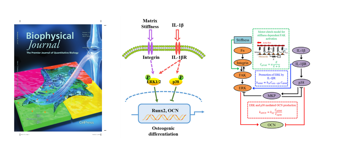 该研究工作构建了具有不同硬度的细胞培养基质,并使用IL-1β模拟了炎症微环境,然后将两者的耦合作用应用于人间充质干细胞(hMSCs),探究hMSCs的成骨分化的分子机制。首先通过实验探索参与成骨分化信号通路中关键分子(ERK1/2,p38)表达规律,并建立基于黏附分子键力学理论(molecular clutch)的细胞力-化学耦合模型,分析力敏感的信号通路与炎症因子介导的信号通路的耦合作用,预测了耦合两条信号通路相的关键信号分子MKP的存在,并得到了实验的验证。结果阐明了力学(基质硬度)-生化(炎症因子IL-1β)耦合作用在成骨分化中的作用机制。