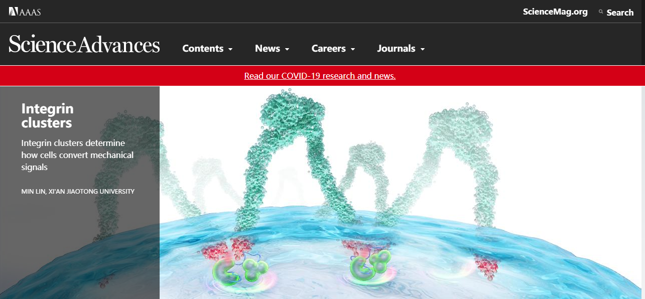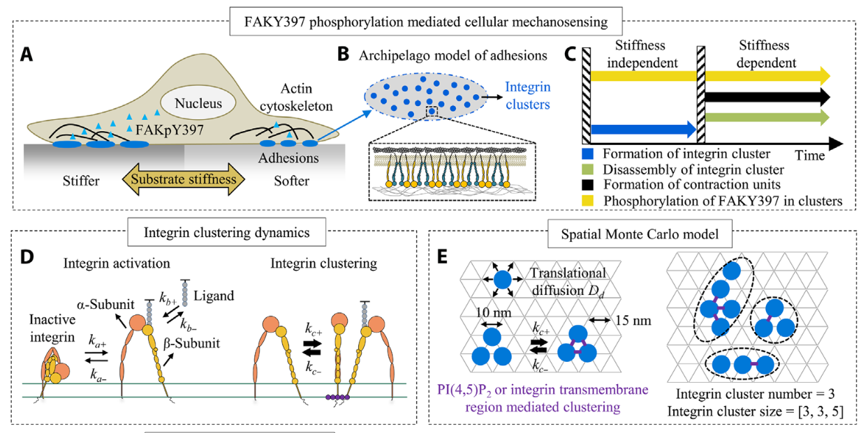 该成果以“整合素团簇通过FAKY397磷酸化调控细胞力敏感行为(Nanoscale Integrin Cluster Dynamics Controls Cellular Mechanosensing via FAKY397 Phosphorylation)”为题,在Science Advances上以封面论文形式发表,并被特别推荐在其主页上。通过耦合整合素分子的激活/聚集动力学过程、整合素团簇分子键的断裂解离及其内部黏着斑激酶磷酸化这三个过程,建立了整合素团簇(integrin cluster)依赖的细胞力学信号转导模型。该模型刻画了不同的细胞外基质刚度(力学信号)与不同种类细胞黏着斑激酶(FAKY397)磷酸化水平(生化信号)的量化关系,并得到了细胞生物学实验结果的验证。通过模型的预测发现:使细胞产生不同的FAKY397磷酸化水平的主要影响因素是细胞骨架牵张力作用下整合素团簇的生存时间(lifetime of cluster)的改变,而不是FAK分子微观动力学参数的改变。进而从细胞骨架牵张力作用下,整合素团簇生存时间的角度揭示了基质刚度依赖的FAKY397磷酸化水平差异的分子机制。由于整合素的异常表达与疾病的发生与发展密切相关,如β3整合素的高表达促进乳腺癌的转移,β1整合素在心肌纤维化的过程中含量逐步升高,因此该研究为进一步开发以整合素为靶向分子的药物提供了理论基础,也为进一步理解“应力-生长”理论提供了重要依据。