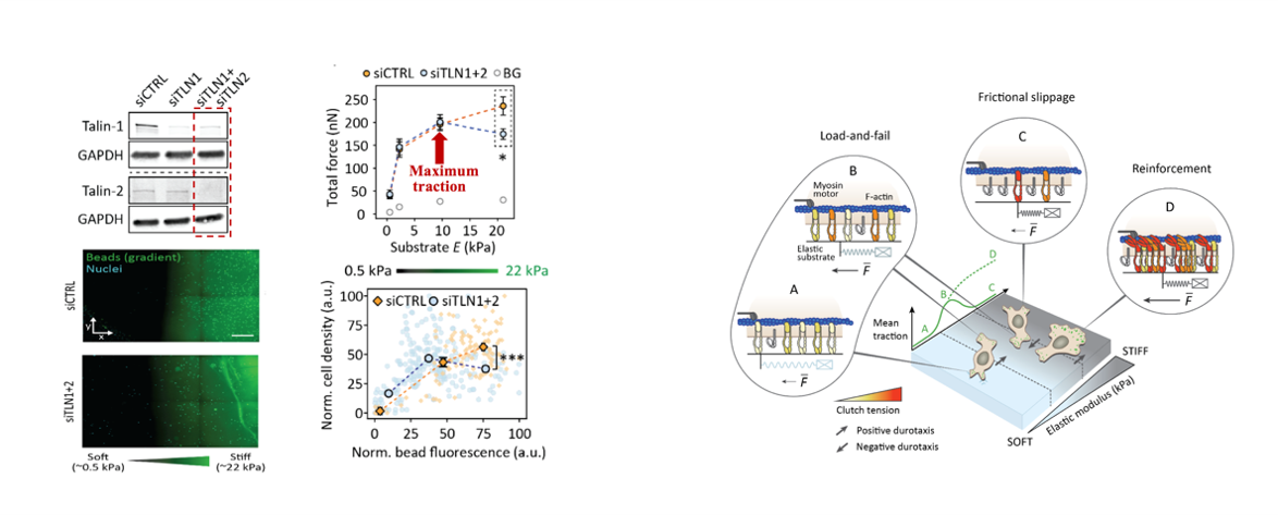 肿瘤迁移是癌症呈现高复发率和高致死性的主要原因之一。整合素是介导癌细胞黏附和迁移的力学敏感跨膜受体。我们的实验研究发现,有别于多数癌细胞的正向迁移行为(低刚度往高刚度方向迁移),脑胶质瘤呈现异常的迁移行为(高刚度往低刚度方向迁移),即逆向迁移。而目前关于整合素介导的细胞迁移行为的力学生物学机制,还缺乏统一的认识。我们提出了基于黏附强化效应的细胞逆向迁移模型并结合分子生物学实验,从踝蛋白(Talin)力致构象变化介导的黏附强化效应角度为癌细胞正向迁移与逆向迁移机制提供了统一的理论解释。该研究工作是与芬兰图库大学Johanna Ivaska教授、美国明尼苏达大学David Odde教授、Mark Distefano教授的合作研究成果。