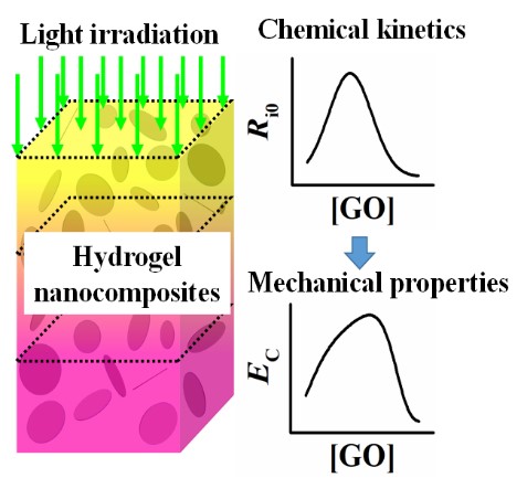 新一代水凝胶纳米复合材料的建模需要研究其加工-结构-力学性能关系。我们建立了一个将合成条件与凝胶动力学和力学性能联系起来的框架,并将其与氧化石墨烯-低聚乙二醇二丙烯酸酯水凝胶体系进行了验证。该模型揭示了掺杂如何降低水凝胶的刚度,为水凝胶纳米复合材料的设计提供了一个强有力的工具。