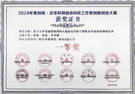2024年12月,在陕西省科学技术协会主办的"秦创原 沣东杯"陕西省科技工作者创新创业大赛中,团队凭借《基于力学重编程原理的大规模高效能干细胞制备技术》项目,经形式审查、初赛评审、路演答辩等环节,从众多参赛项目中脱颖而出,荣获大赛一等奖。
