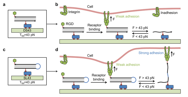 图1.在dsDNA基底,当整合素与RGD结合产生的拉力超过43 pN时,RGD将从基质表面解离,导致细胞无法黏附;若作用力低于43 pN,细胞则维持弱黏附状态。在slDNA基底,当整合素-RGD作用力超过43 pN时,茎环构象被打开但RGD仍锚定在基质上,使细胞保持强黏附状态;若作用力低于43 pN,细胞呈现相对较弱的黏附状态。