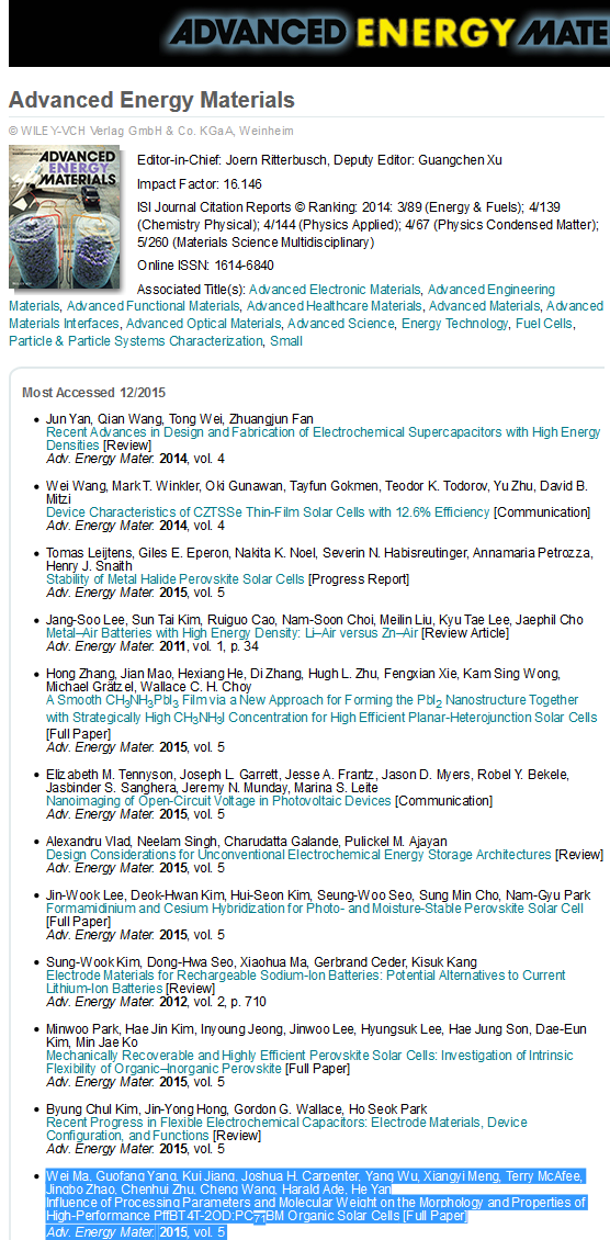 一篇Adv. Energy Mater. 论文入选“most accessed”文章(one AEM paper is featured as the most accessed paper)