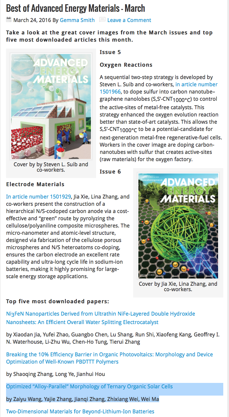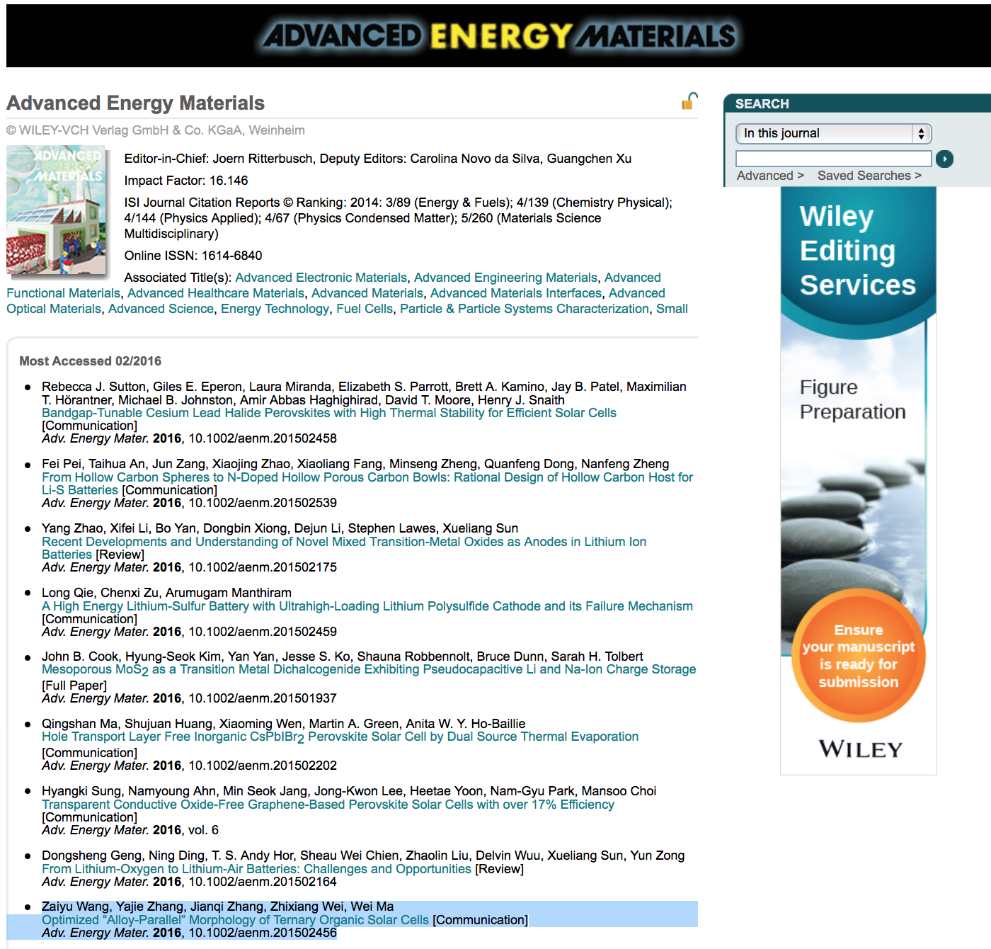 Adv. Energy Mater. 论文入选“most accessed”文章和Materials View下载最多TOP 5