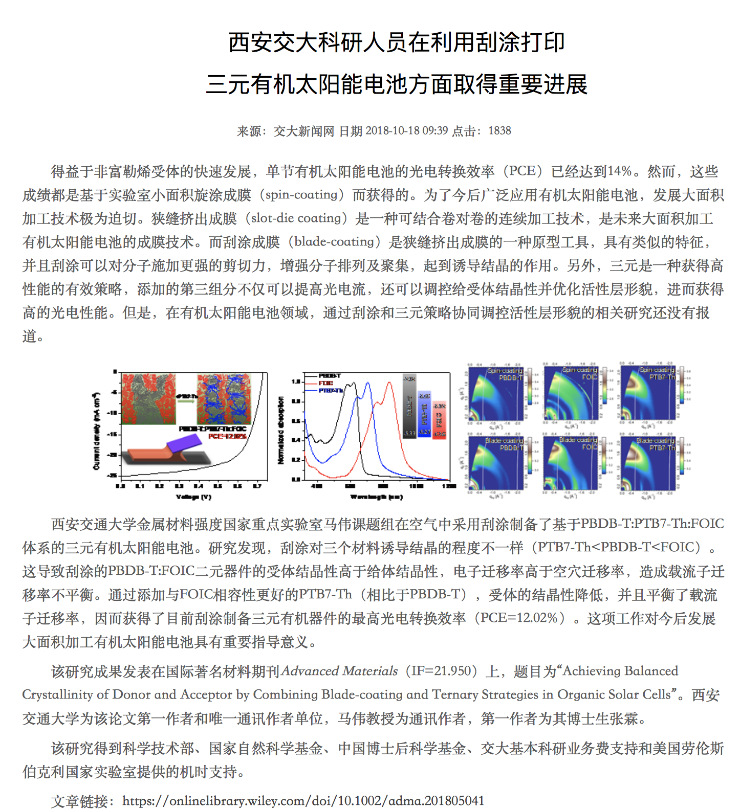 刮涂打印高性能三元有机太阳能电池发表在《Advanced Materials》