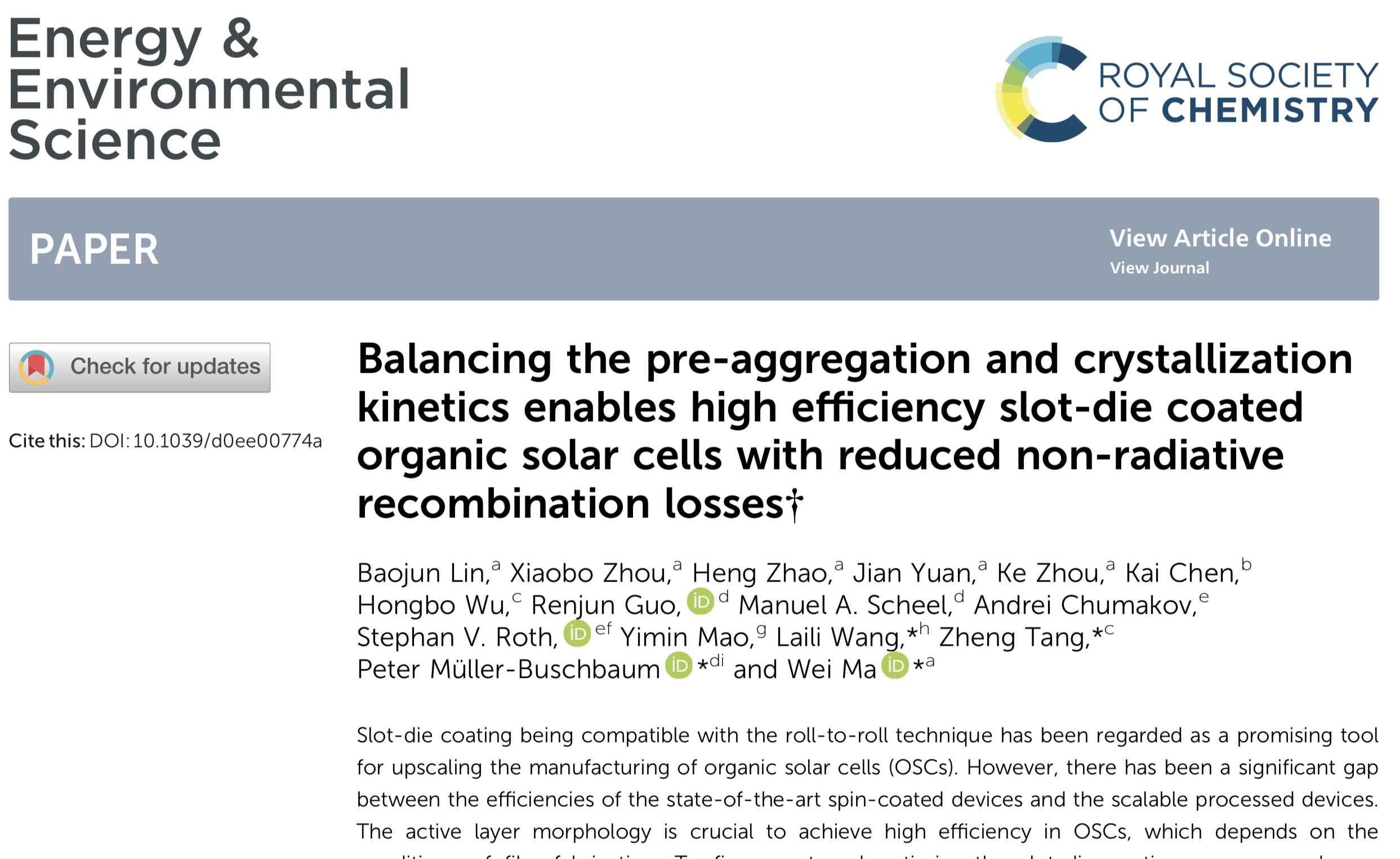 祝贺林保均利用Slot Die调节预聚集与结晶动力学平衡的工作发表在Energy Environ. Sci.
