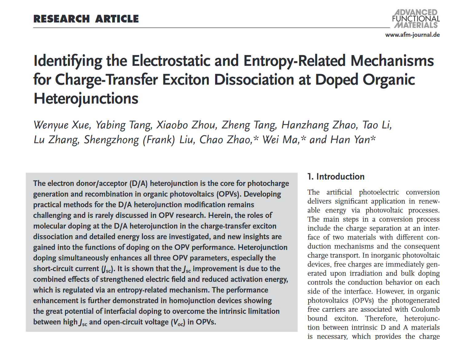 祝贺薛文悦在掺杂有机光伏电荷转移激子分离机理方面的工作发表在《Adv. Funct Mater.》