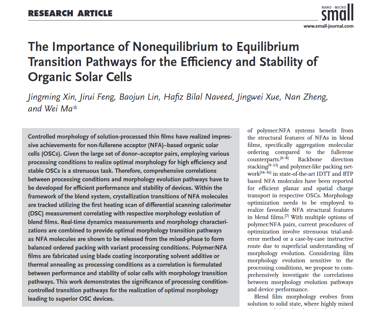 祝贺辛景明在揭示聚合物非富勒烯体系非平衡态形貌转化路径的工作发表在《Small》