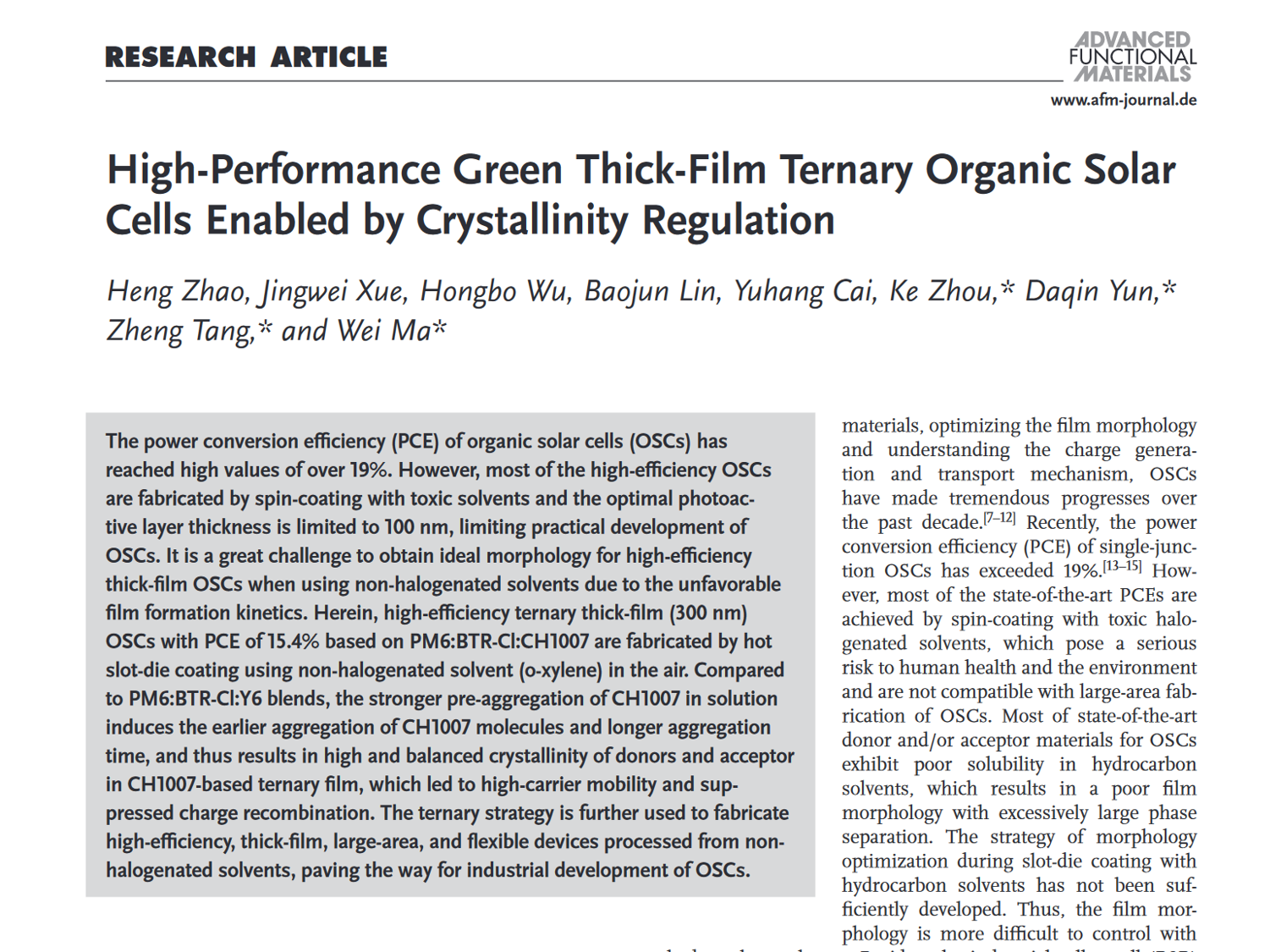 祝贺赵恒高效三元厚膜有机光伏方面的工作发表在《Adv. Funct. Mater.》