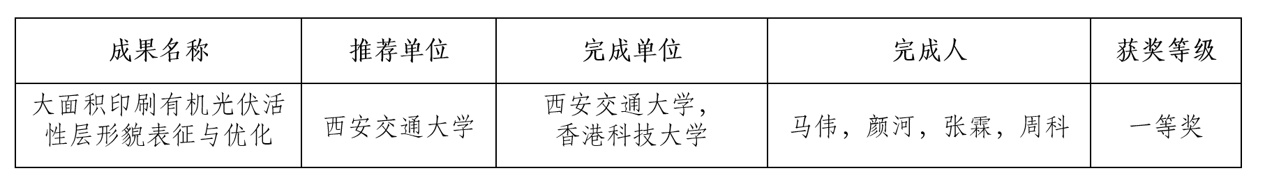 近日,陕西省教育厅公布了2023年度陕西高等学校科学技术奖授奖名单,课题组和香港科技大学颜河教授合作完成的研究成果《大面积印刷有机光伏性