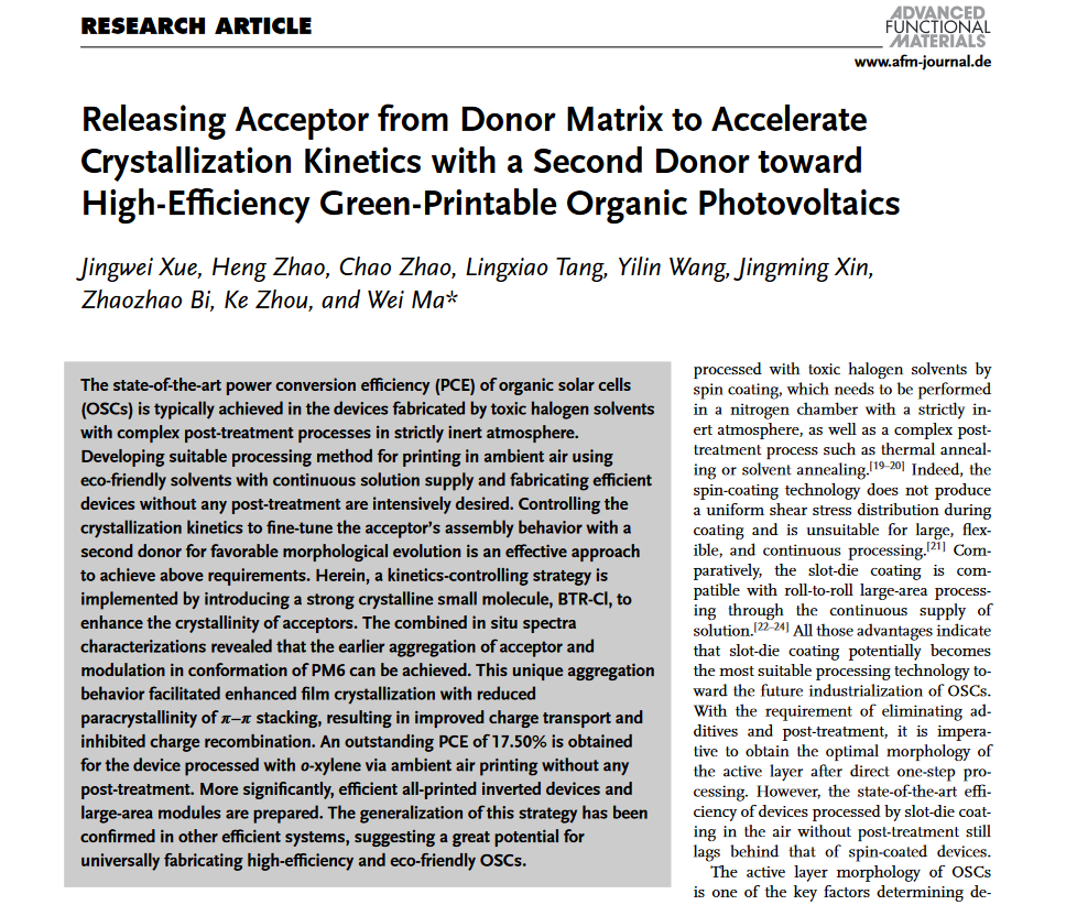 祝贺薛静炜调节结晶动力学过程实现高效绿色打印有机光伏电池的成果发表在《Adv. Funct. Mater.》