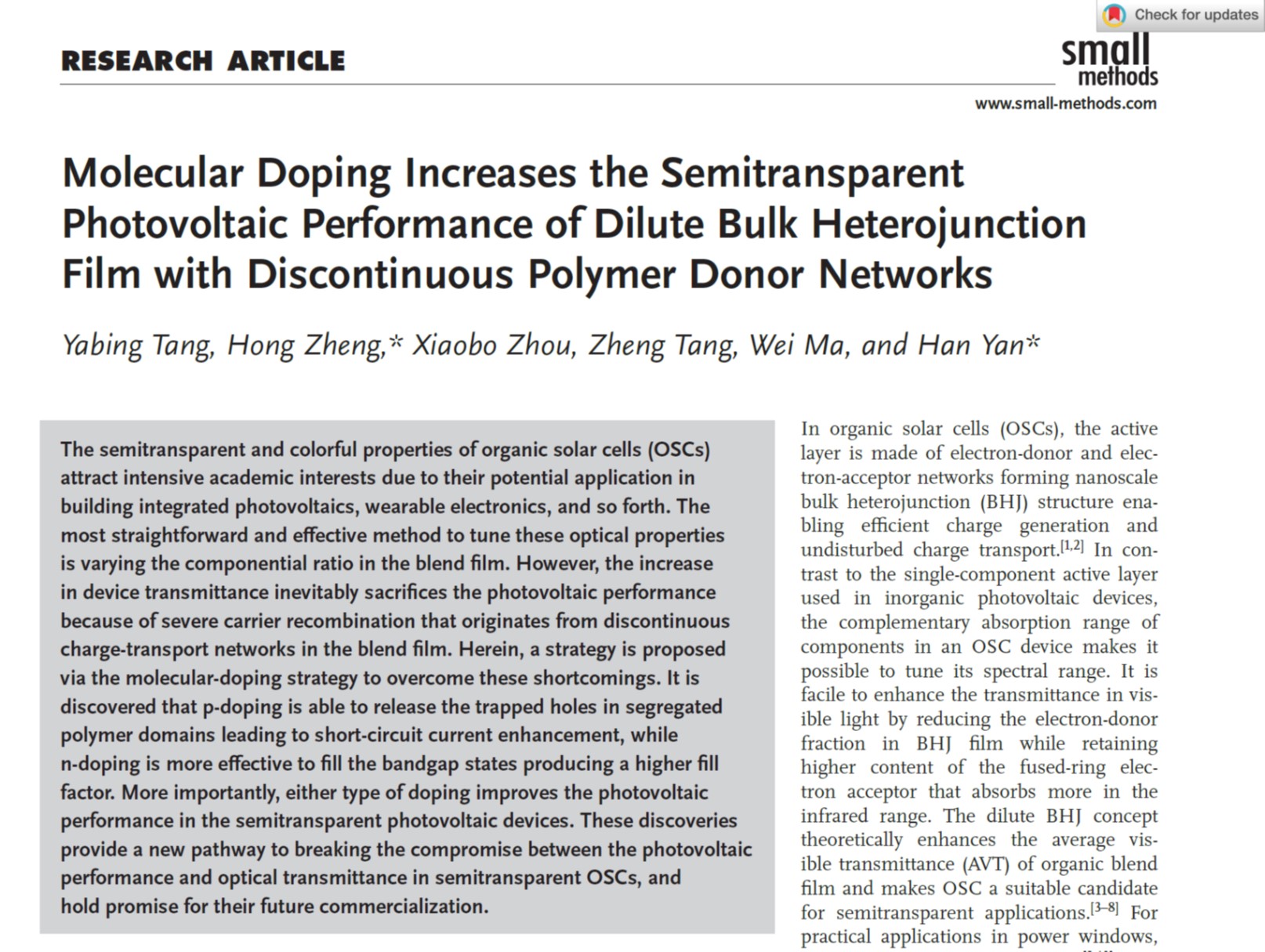 文章标题:分子掺杂半透明有机太阳能电池文章在Small Methods上发表