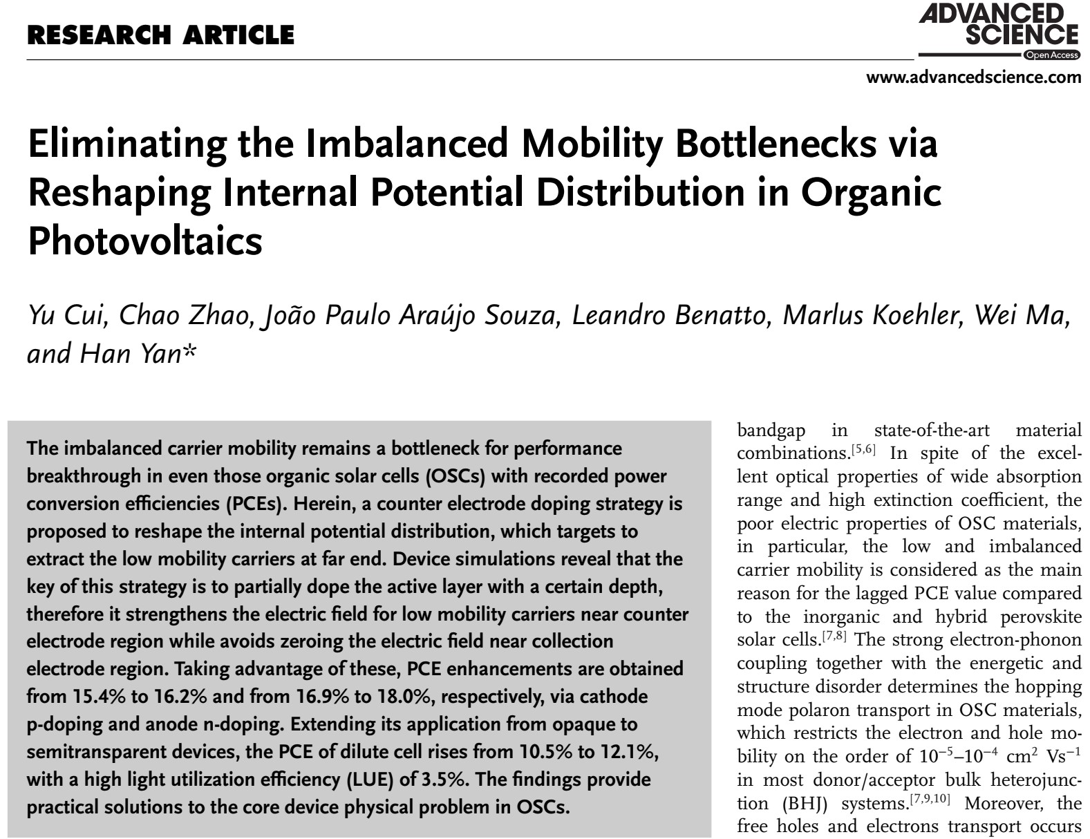 内建电势分布修饰提升载流子收集效率文章在Adv. Sci.上发表