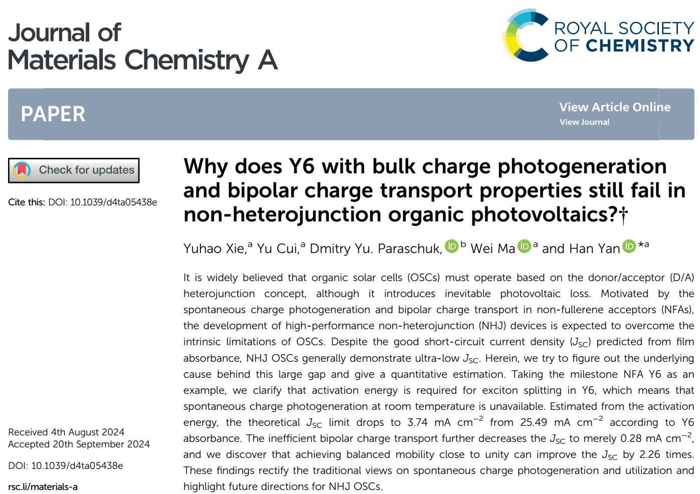 文章标题:Y6非异质结光伏器件低电流机理文章在J. Mater. Chem. A上发表