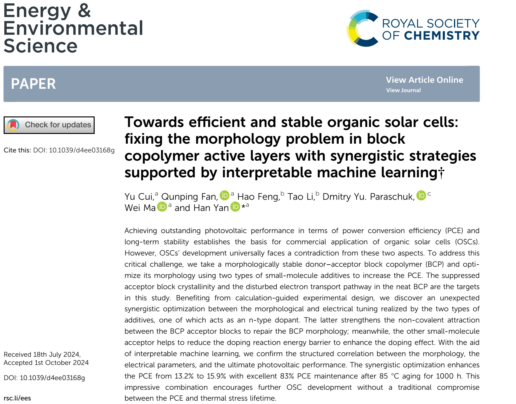稳定高效体相共聚物光伏文章在Energy Environ. Sci.上发表