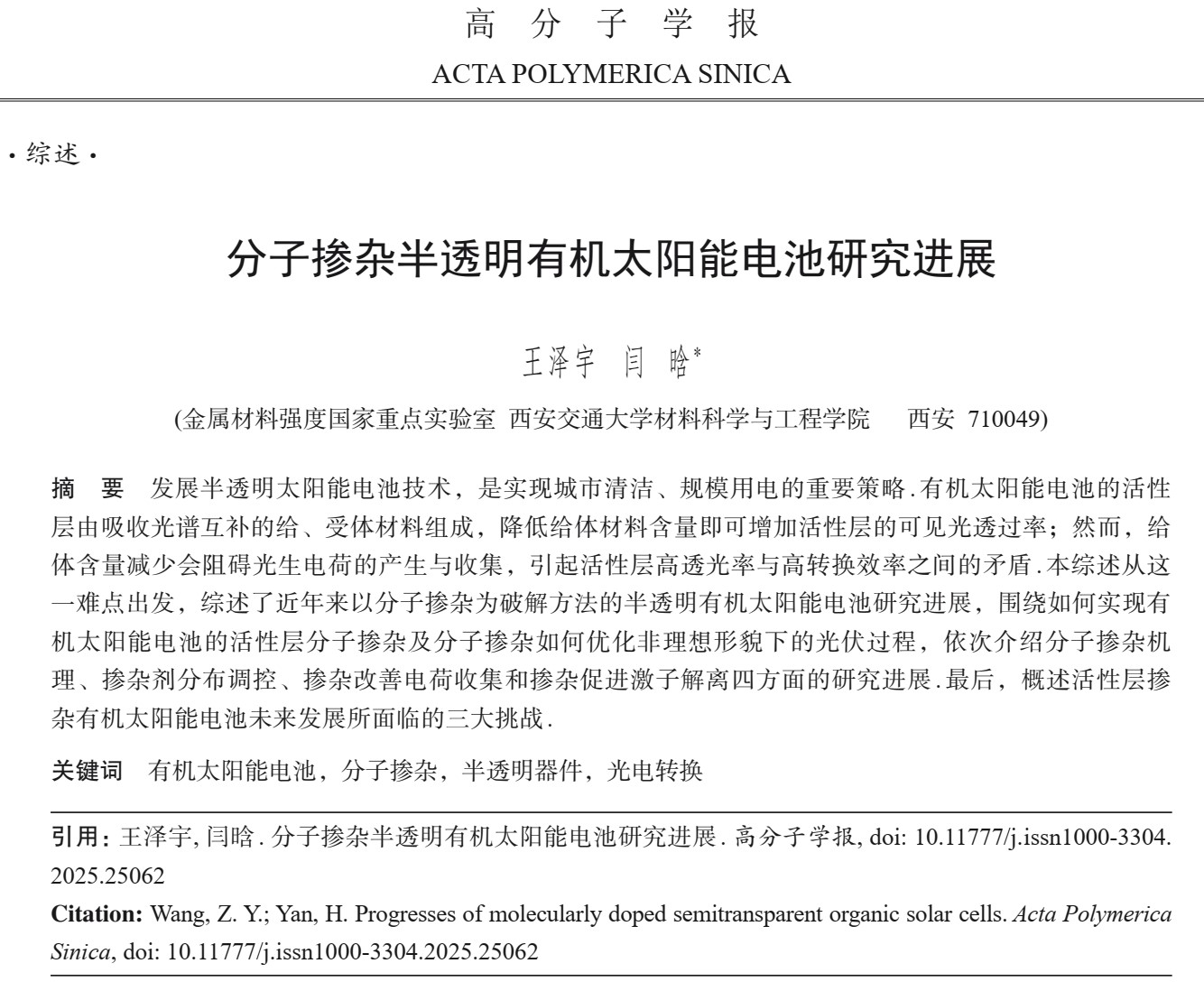 文章标题:分子掺杂半透明有机光伏特约文章在高分子学报上发表