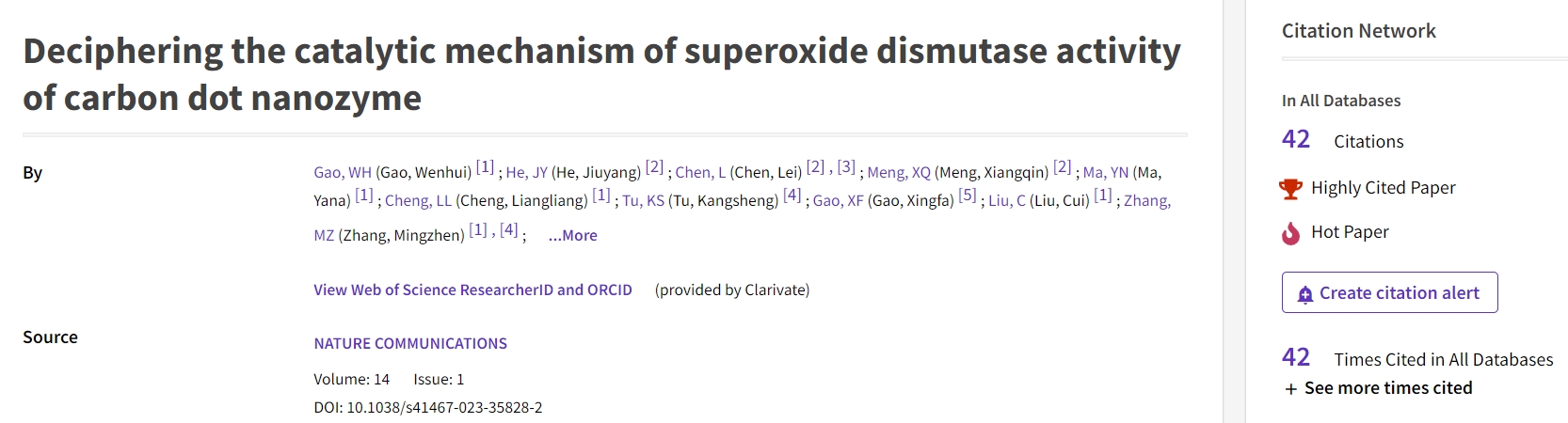 文章标题:碳点纳米酶工作入选ESI高被引及Hot paper!!!