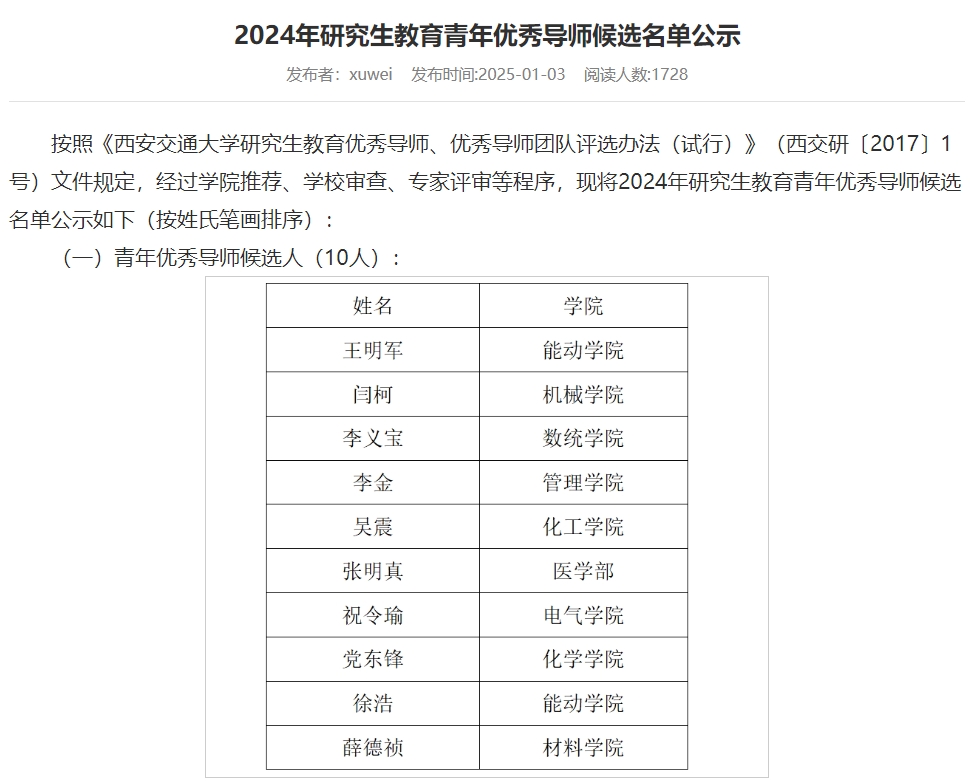 文章标题:张明真老师入选西安交通大学2024年研究生教育青年优秀导师,祝贺!!!