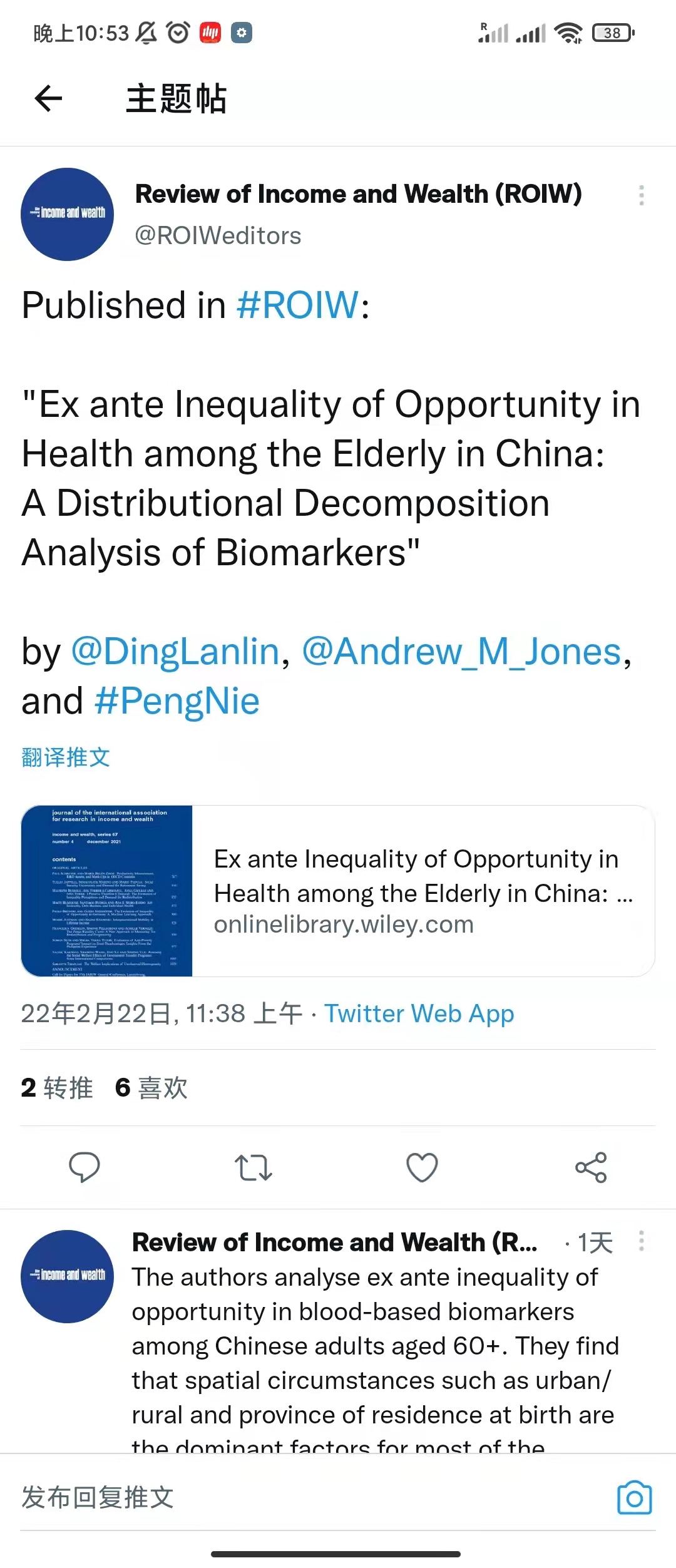 博士生丁兰琳已发表于Review of Income and Wealth有关我国老年人事前健康机会不平等的合作研究被Twitter平台报道