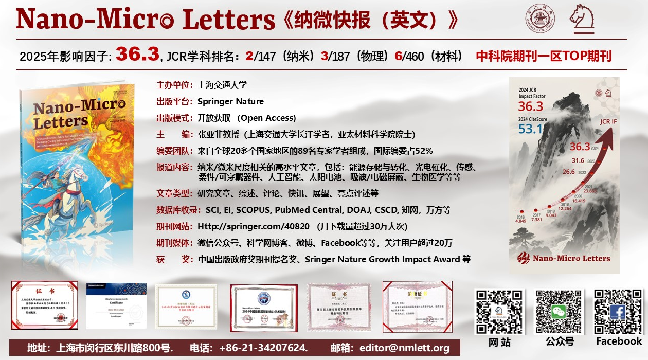 Nano-Micro Letters《纳微快报(英文)》是一本聚焦纳米/微米科技领域研究前沿的国际学术期刊,创办于2009年,上海交通大学主办、在Springer Nature开放获取(open-access)出版的学术期刊,主要报道纳米/微米尺度相关的高水平文章(research article, review, communication, perspective, highlight, etc),包括微纳米材料与结构的合成表征与性能及其在能源、催化、环境、传感、电磁波吸收与屏蔽、生物医学等领域的应用研究。已被SCI、EI、PubMed、SCOPUS等数据库收录,2024 JCR IF=36.3,学科排名Q1区前2%,中科院期刊分区1区TOP期刊。多次荣获“中国最具国际影响力学术期刊”、“中国高校杰出科技期刊”、“上海市精品科技期刊”等荣誉,2021年荣获“中国出版政府奖期刊奖提名奖”。欢迎关注和投稿。Web: https://springer.com/40820 E-mail: editor@nmlett.org Tel: 021-34207624