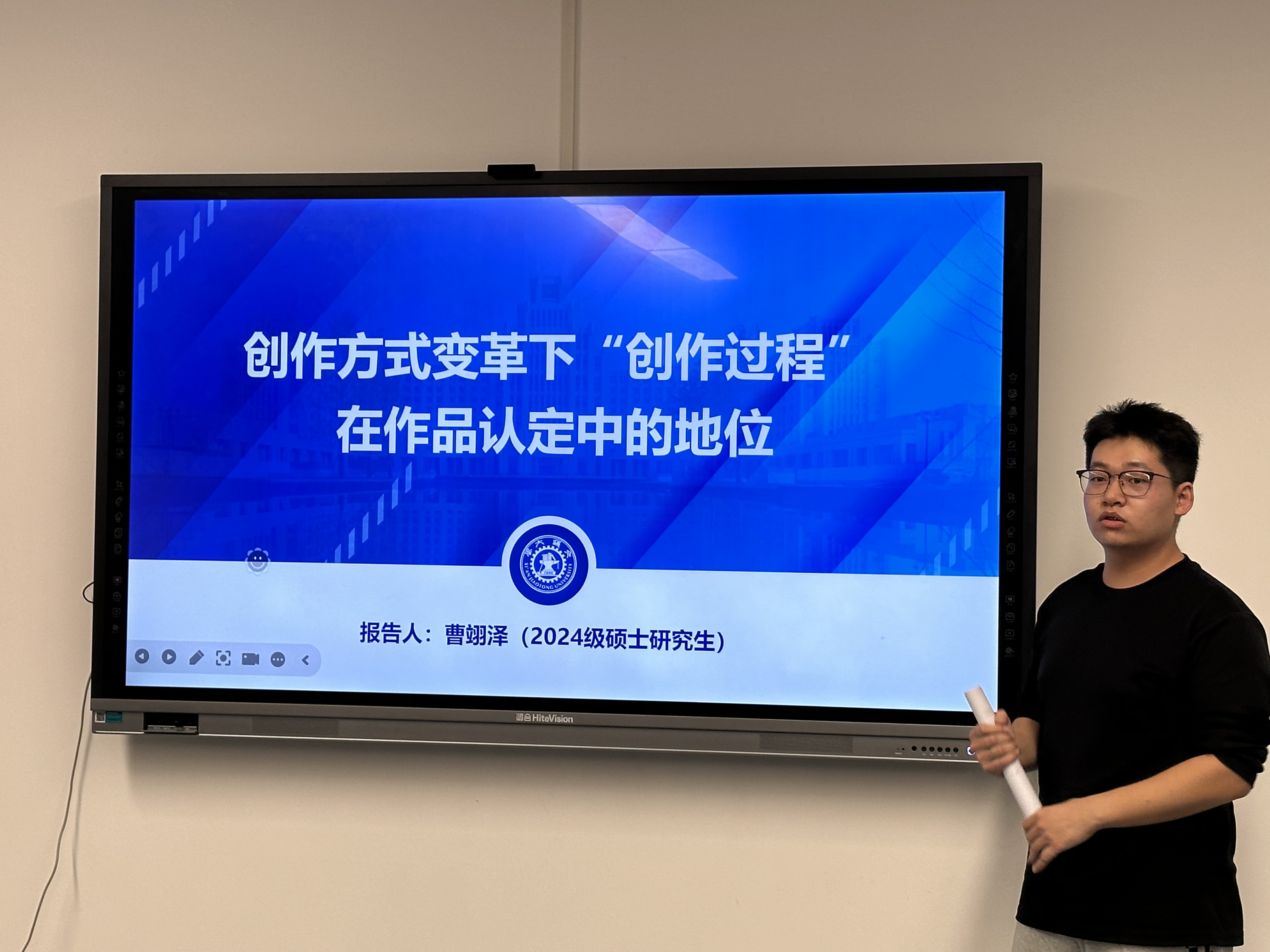 接着,团队2024级硕士研究生曹翊泽进行了论文汇报,题目为《创作方式变革下“创作过程”在作品认定中的地位》,文章以“创作过程”为切入点,分析了司法实践关注“创作过程”的原因以及理论适应性,进而提出“创作过程”认定规范化的司法实践路径。