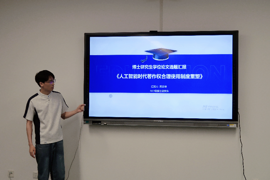 汇报环节,梁龙坤以《人工智能时代著作权合理使用制度重塑》为题,从选题背景、研究问题、研究现状、研究框架等方面汇报了选题的基本情况。