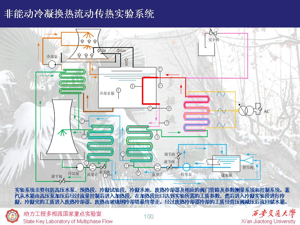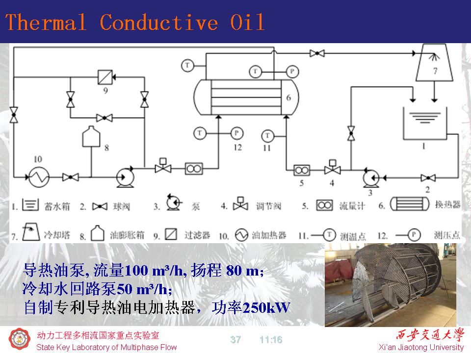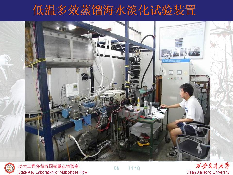 万吨级低温多效海水淡化装置:受神华国华电力研究院有限公司委托,开展了水平管降膜蒸发传热试验等系列研究工作,开发了包括蒸发换热器、蒸汽引射器、冷凝器等部件的万吨级低温多效海水淡化装置热力系统计算软件,成功应用于黄骅电厂的12500t/d、25000t/d海淡装置的设计,产品达到设计指标,运行良好。