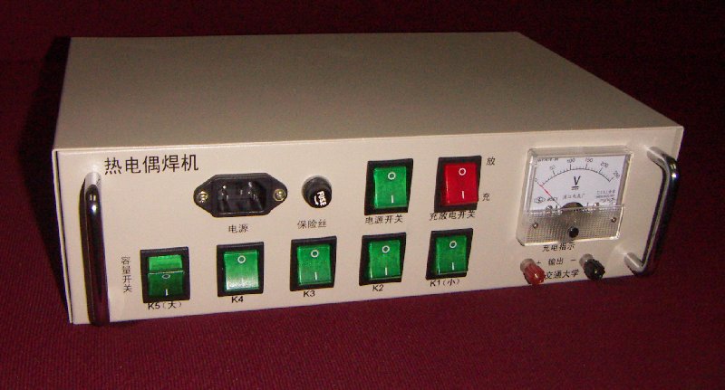 热电偶焊机使用电容充电,利用电容瞬间放电获得的大电流,来焊接直径0.1-1mm各种不同材质的金属丝,可用于热电偶的制作以及各种金属表面温度测点的焊接。已在几十个研究所、大学实验室使用多年,工作可靠。