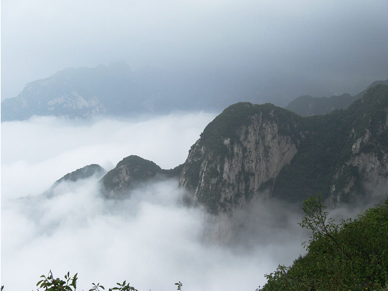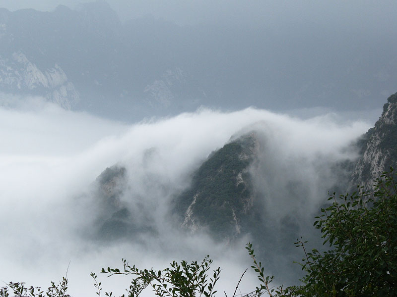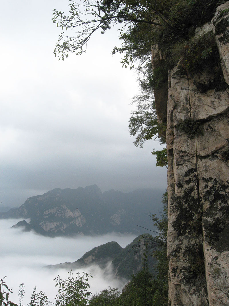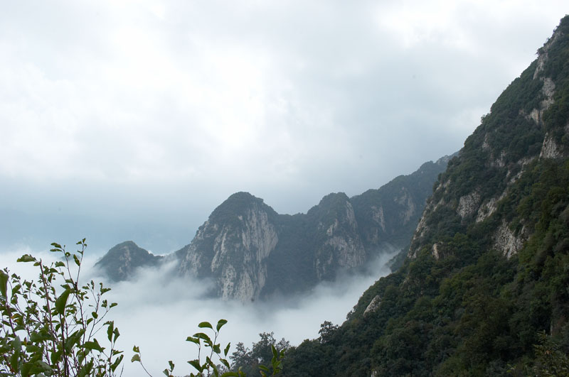 分水岭稍作休息,继续前行,便到了嘉午台山的陡险之地"蹬云梯"和"朝天梯"。"蹬云梯"是长约20米、80°的直立陡壁,数十级石阶凿在悬崖上,两侧是深不见底的沟谷。刚踏上去不由使人产生一种战战兢兢的感觉。 "蹬云梯"之上,有一位在此修行的僧人,我们和他真诚地交谈了一番,听他阐释佛家文化。在这陡险之后的开阔处,看层峦叠嶂间云卷云舒,访深山古刹中空灵梵音,别有一番韵味。“朝天梯”是一个约50米高的崖壁,三面临空,上面凿有石阶,两侧有明万历十一年(1583)铸造的铁索链,可攀援而上。回首俯视,有腾空之险。