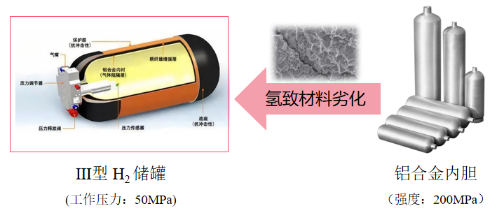 随着今年两会习总书记对我国双碳目标的再次强调,氢能作为新型清洁能源,因其来源多样、利用高效等特点引发了更加广泛的关注,而储氢压力容器作为氢能运输与储存的重要机械装备,其安全性是限制氢能大规模运用的难点问题,主要原因有以下两点,其一:氢致材料劣化作用导致H2储罐在高压条件下的安全性无法保障(如图1),其二:工作压力达到70MPa以上的储氢罐目前主要依赖于进口。