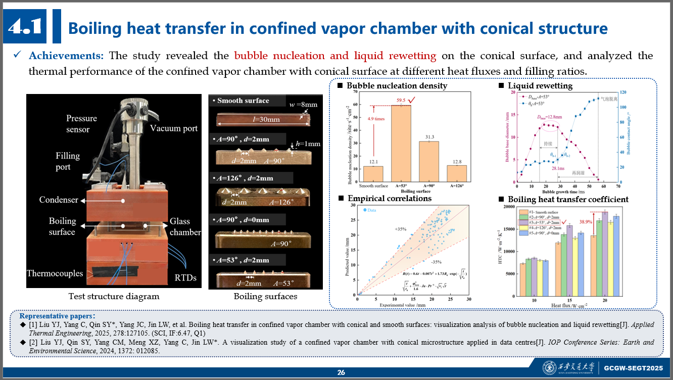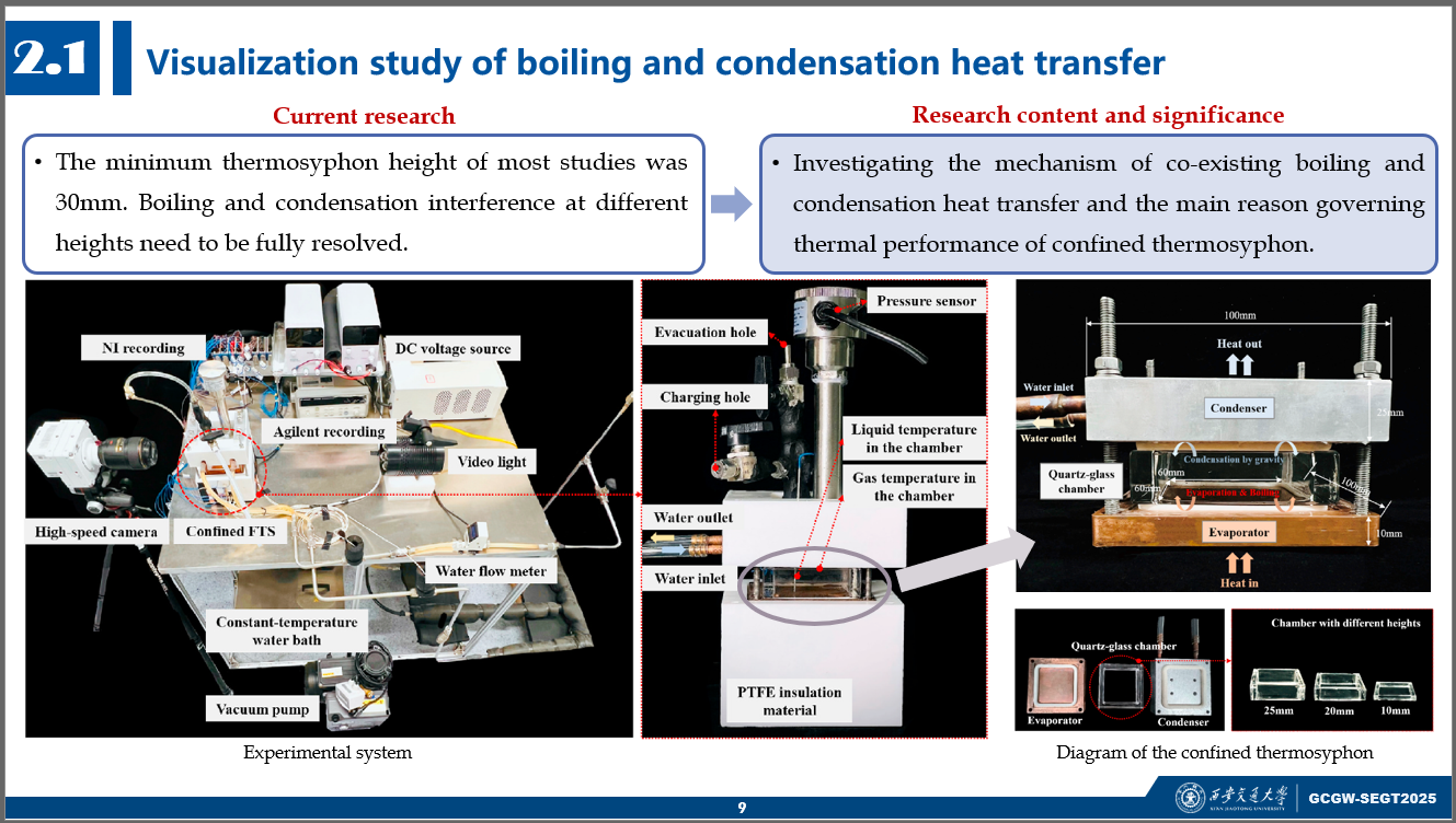 秦思宇老师担任Energy Efficiency & Green Buildings分会场主席(Session Chair),并作关于”Investigation on heat transfer enhancement of compact thermosyphon with different modified surfaces“主题的研究汇报,阐述关于紧凑型热虹吸管/蒸汽腔内气液两相传热机理及润湿性改性强化的相关成果,旨在为电子设备冷却背景下的相变传热强化提供参考。该研究获得SEGT国际会议的Best Presenter Award奖项。