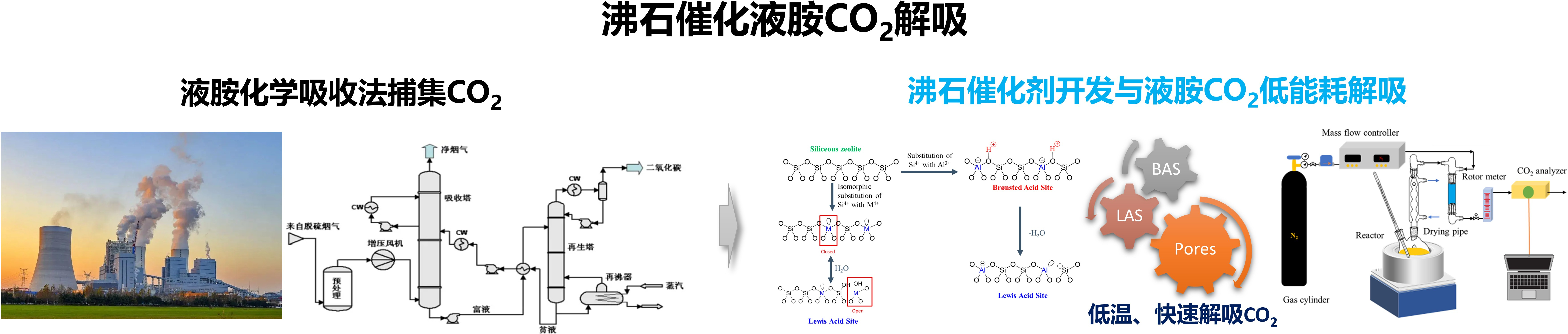 液胺化学吸收法利用胺液吸收剂与CO₂发生可逆反应实现选择性捕集,技术成熟且应用广泛,但面临解吸能耗高、运行成本大的挑战。为此,课题组致力于开发低能耗解吸技术,聚焦于沸石催化胺液解吸过程,开展沸石催化剂的设计与合成研究。