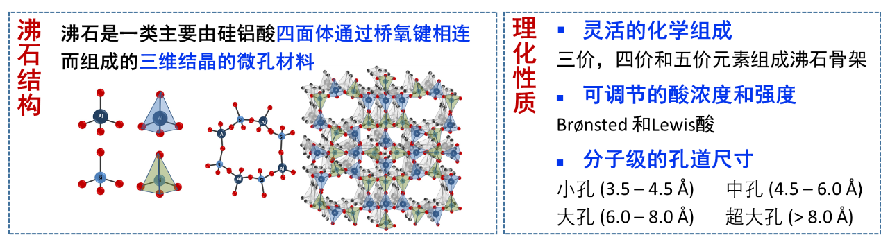 严格定义上讲,沸石是一类主要由硅铝酸四面体通过桥氧键相连而组成的三维结晶的微孔材料。然而目前,沸石的骨架元素已不再局限于硅和铝元素,而是拓展为B、Ga、Ge、Ti等元素,也被称为Zeotypes(类沸石材料),例如AlPO, SAPO, GaPO, titanosilicates, germanosilicate等。