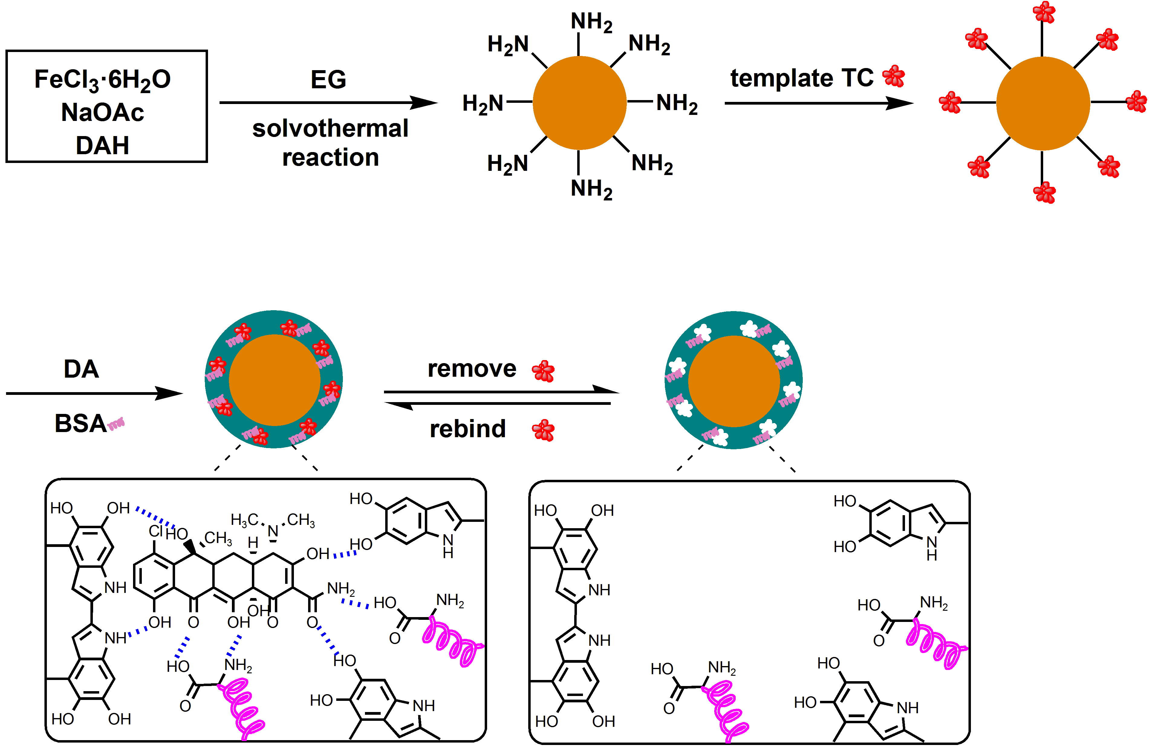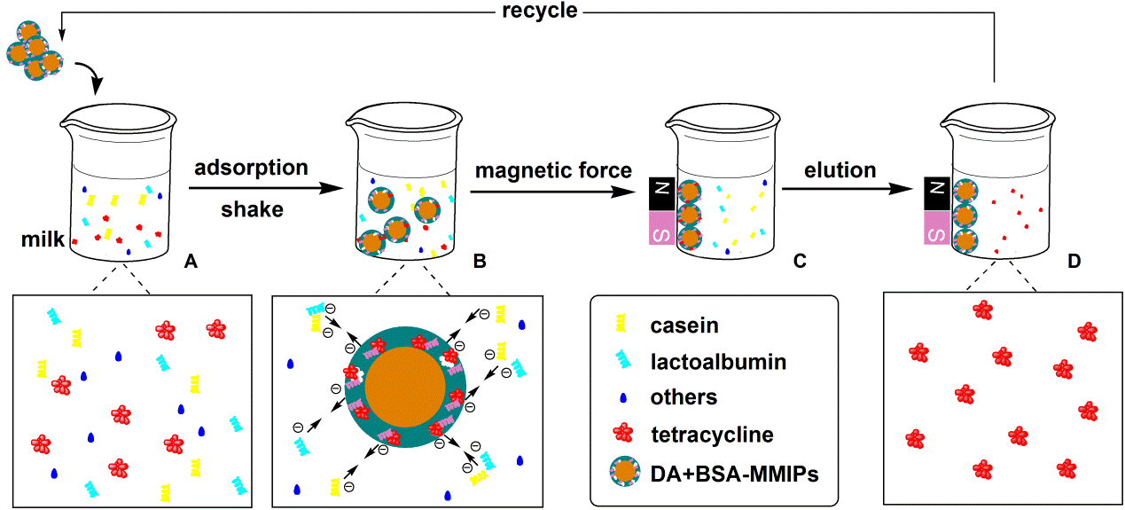 该工作首次采用牛血清蛋白和多巴胺作为双功能单体制备四环素分子印迹磁性纳米材料,发展了用分子印迹磁性纳米材料直接从牛奶样品中选择性分离富集四环素的新方法,提供了一种直接从复杂的蛋白质样品中特异性分离和测定目标化合物的新思路。