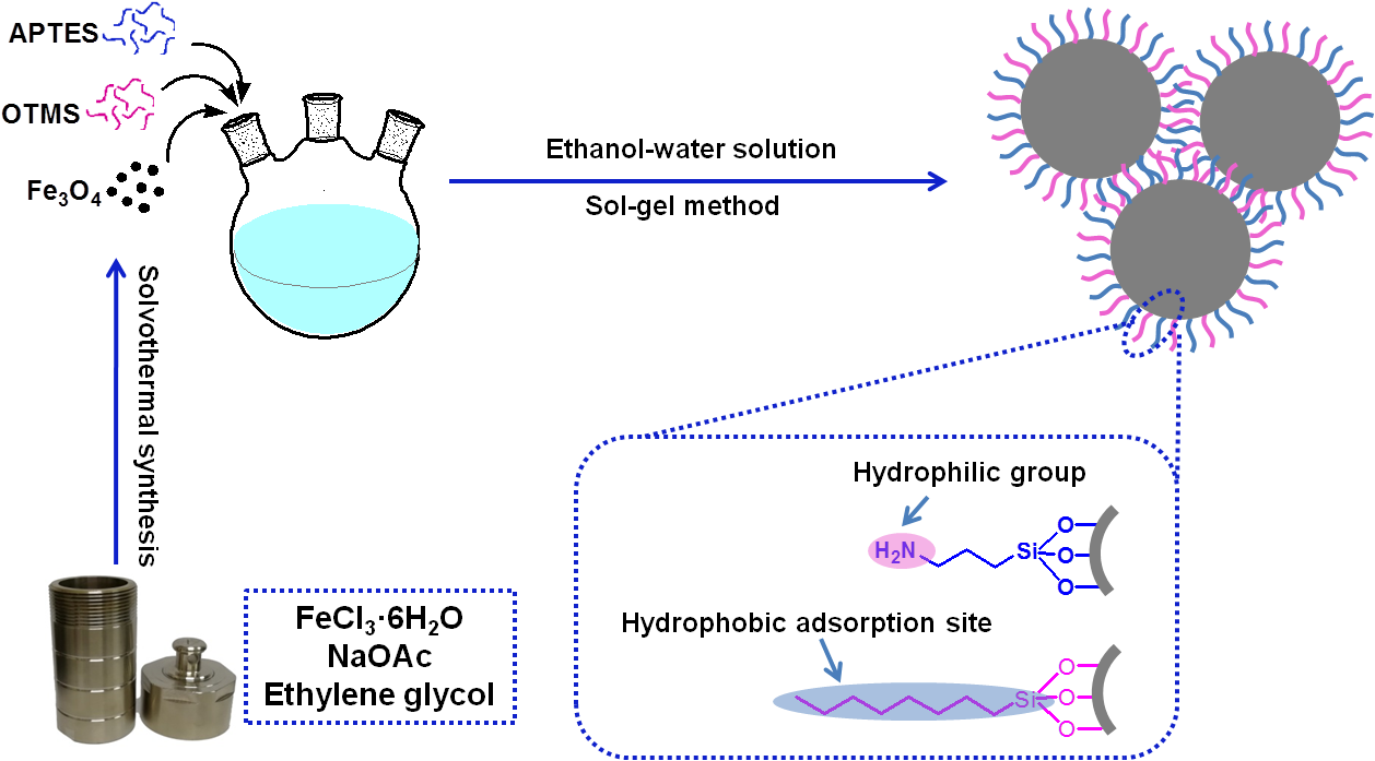 该工作首次通过一步溶胶-凝胶法制备了两亲性磁性纳米球,发展了一种构建两亲性磁性纳米吸附剂的新方法。采用该方法制备的吸附剂对水环境中邻苯二甲酸酯表现出优异的吸附能力,为两亲性吸附剂的合成提供了新的思路。
