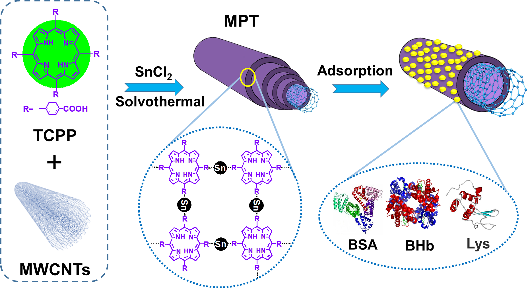 该工作开发了一种新颖的策略运用Sn作为TCPP的交联剂形成TCPP-Sn网络聚合物,同时该TCPP-Sn网络聚合物通过非共价相互作用包覆在碳纳米管的表面。该策略仅需一步溶剂热过程即可实现,无需对原料进行任何预修饰,并且TCPP-Sn网络聚合物壳层均匀连续,厚度可控,赋予其均匀可调的吸附位点,对于常见蛋白具有优异的吸附性能和普适性。