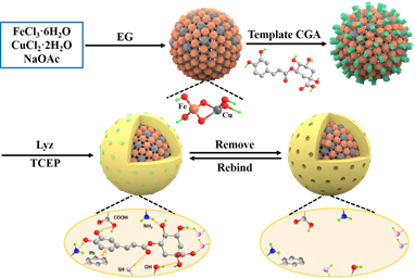 该工作以一步溶剂热法合成的铜掺杂磁性微球为载体,绿原酸为模板分子,溶菌酶为功能单体,通过溶菌酶的还原聚合反应制备了具有耐酸型相转变溶菌酶印迹层的磁性分子印迹纳米材料。此外,所得材料作为固相萃取剂与HPLC联用,建立了一种高效提取和检测金银花中绿原酸的新方法。