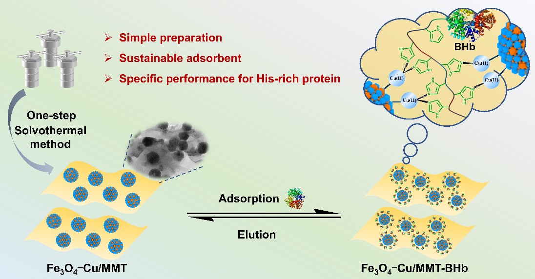 该工作通过简单的一步溶剂热法制备了一种蒙脱土支撑的铜掺杂磁性纳米复合材料Fe3O4-Cu/MMT,作为新型固定化金属亲和吸附剂用于选择性分离富含组氨酸蛋白质。所得的Fe3O4–Cu/MMT具有良好的分散性、较大的比表面积、优异的磁响应性能、简便的制备步骤、高的吸附容量(758.7 mg/g)、较快的动力学吸附速率(75 min)、优异的选择性以及重复利用性,且能成功从牛血样中选择性分离和去除BHb,具有实际应用潜力。