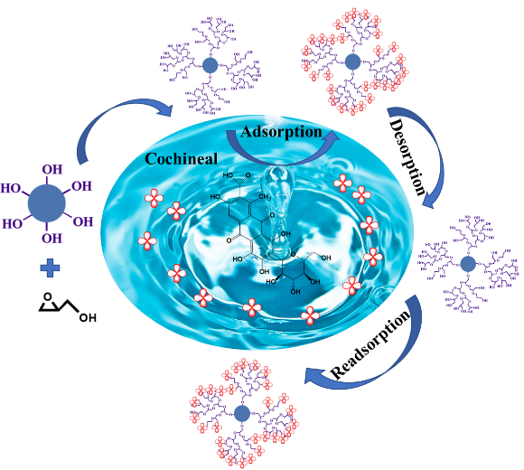 该工作首次提出以Fe3O4为载体,缩水甘油醚为功能单体,通过开环反应制备出超支化聚缩水甘油醚磁性吸附剂(Fe3O4-HPG),并以其作为固相萃取吸附剂结合高效液相色谱对实际环境水样中的胭脂虫红进行高效地吸附、富集和检测。超支化聚缩水甘油不仅具有好的溶解性、生物相容性和原料廉价易得的优点,还具有丰富的官能团以及优异的分散性,因此以缩水甘油醚为功能单体所制备的吸附剂有效地提高了对目标物的吸附能力。本研究为吸附、回收和检测环境中的胭脂虫红、其他种类色素、污染物以及有价值的小分子物质提供了新方法,为研究者们开发高效的新型吸附剂提供了新思路。