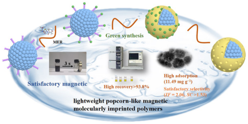该工作首次提出了通过一种简单绿色的溶剂热法合成爆米花状磁性纳米颗粒并作为载体,以正硅酸乙酯为功能单体,制备出轻质磁性分子印迹聚合物用于选择性吸附和去除美罗培南。通过聚乙二醇-4000对磁性材料表面进行修饰得到爆米花状Fe3O4,该载体的成功合成不仅赋予了材料超顺磁性的特性还极大程度上地降低了材料的质量,提高了其单位质量的吸附量、选择性。本研究为吸附和检测环境水和血浆中的美罗培南及其他种类抗生素、污染物以及有价值的小分子物质提供了新方法,为研究者们开发高效的新型轻质分子印迹聚合物提供了新方法。